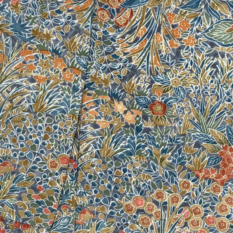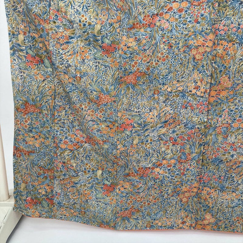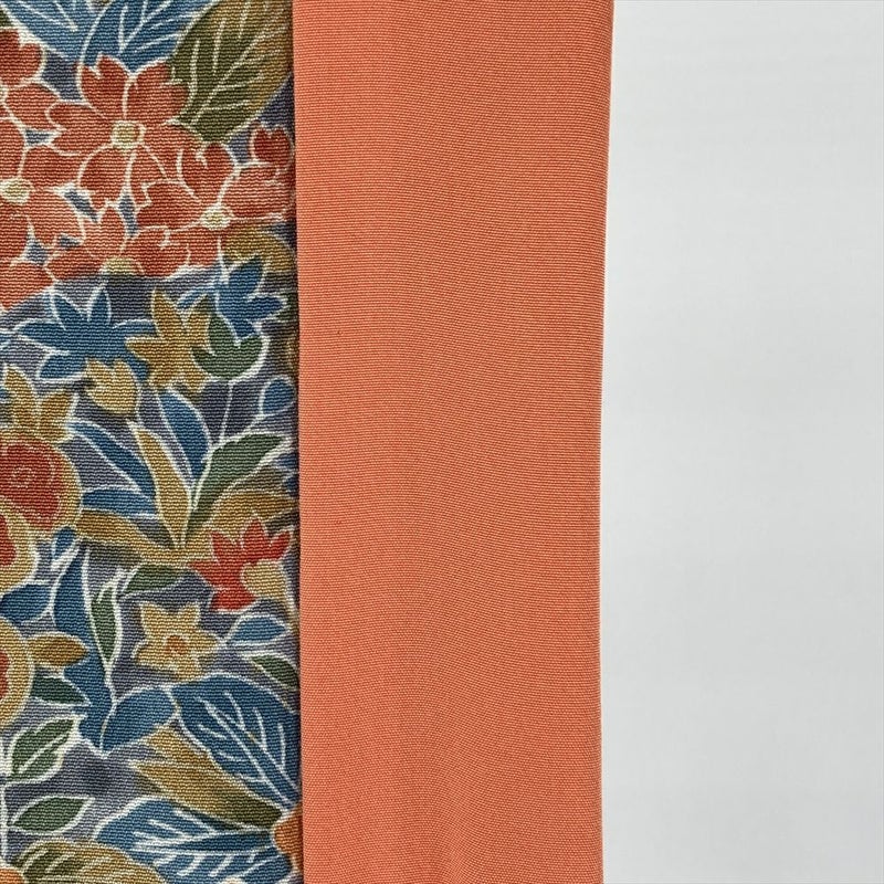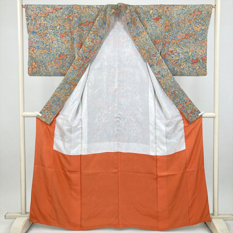 (中古) 小紋 グレー 青 カジュアル 草花文 袷 絹【身丈】158cm【裄丈】66.5cm