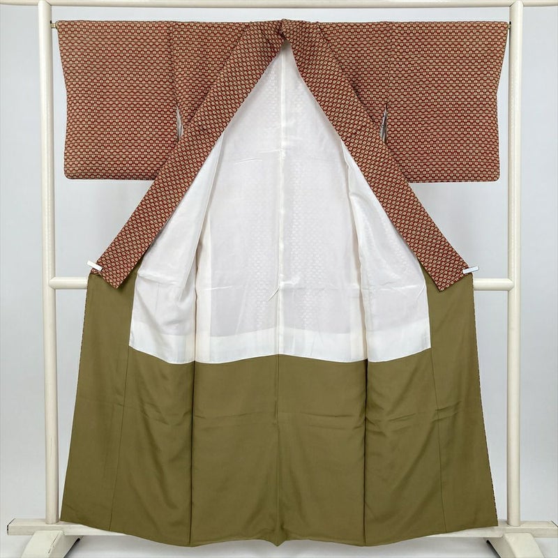 (中古) 小紋 赤 カジュアル 縮緬 遠州椿 袷 絹【身丈】152cm【裄丈】67cm