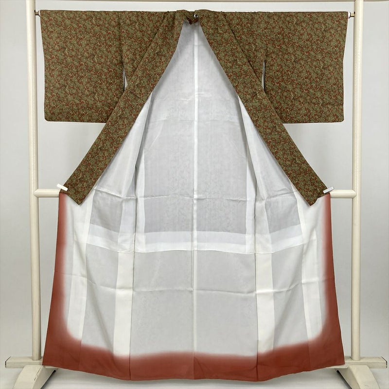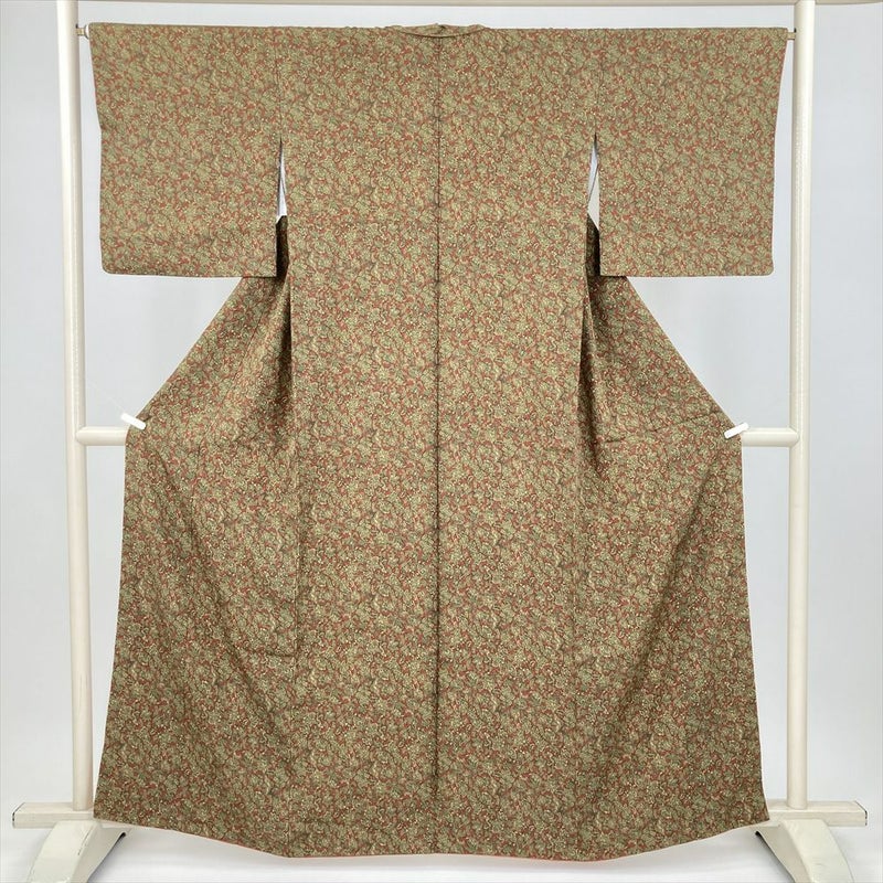 (中古) 小紋 赤茶 カジュアル 縮緬 更紗調 オリエンタル 袷 絹【身丈】154cm【裄丈】66.5cm
