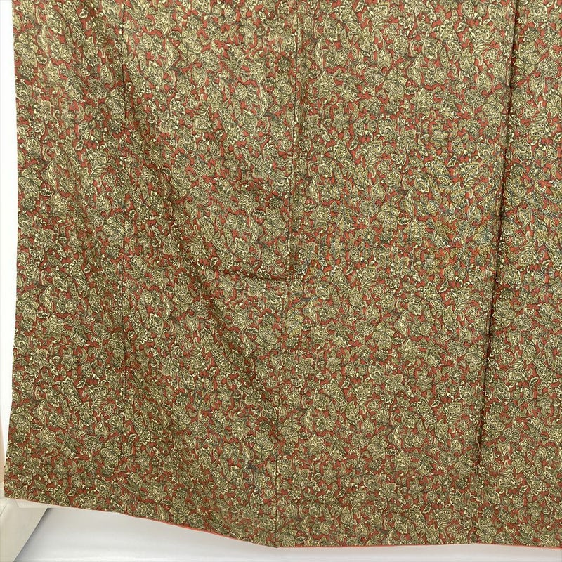 赤茶の縮緬地に、更紗調のオリエンタルな柄が広がる小紋です。