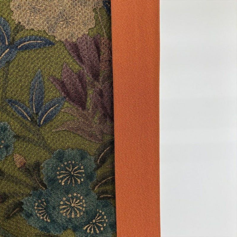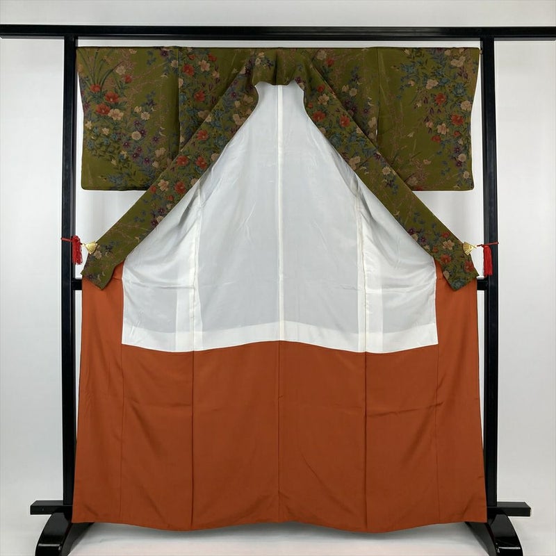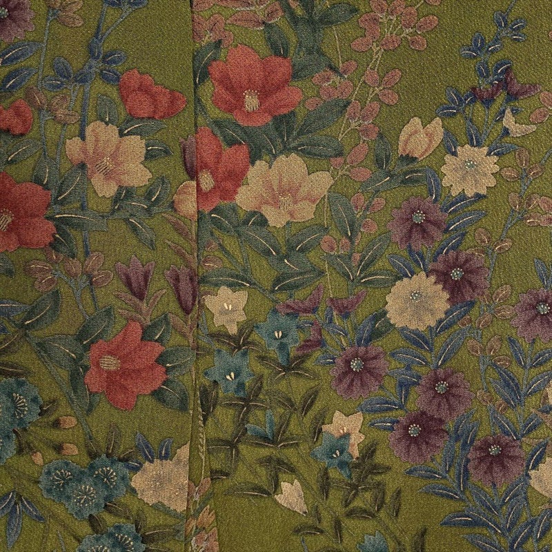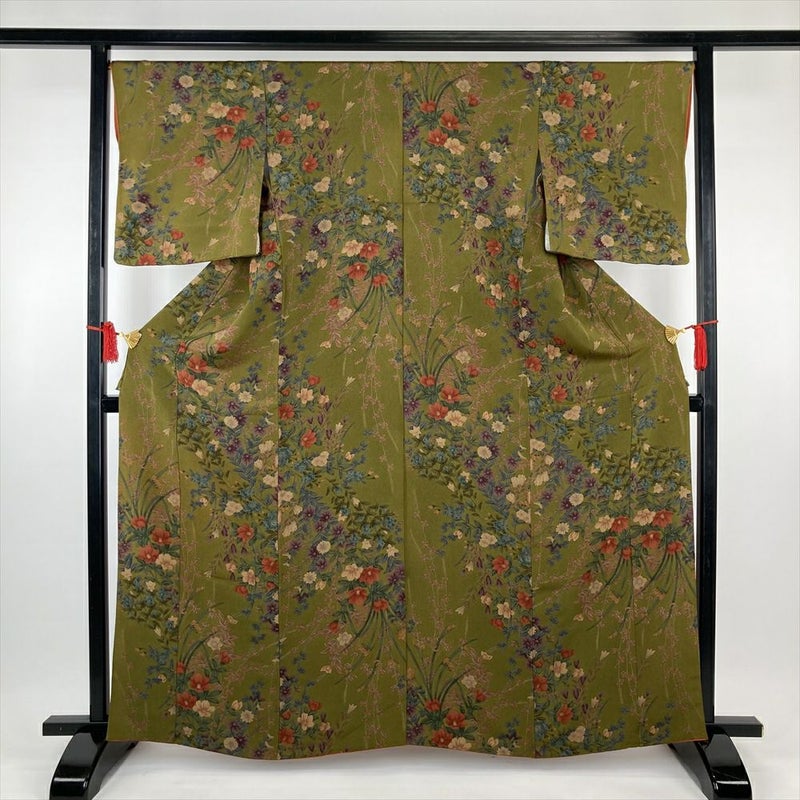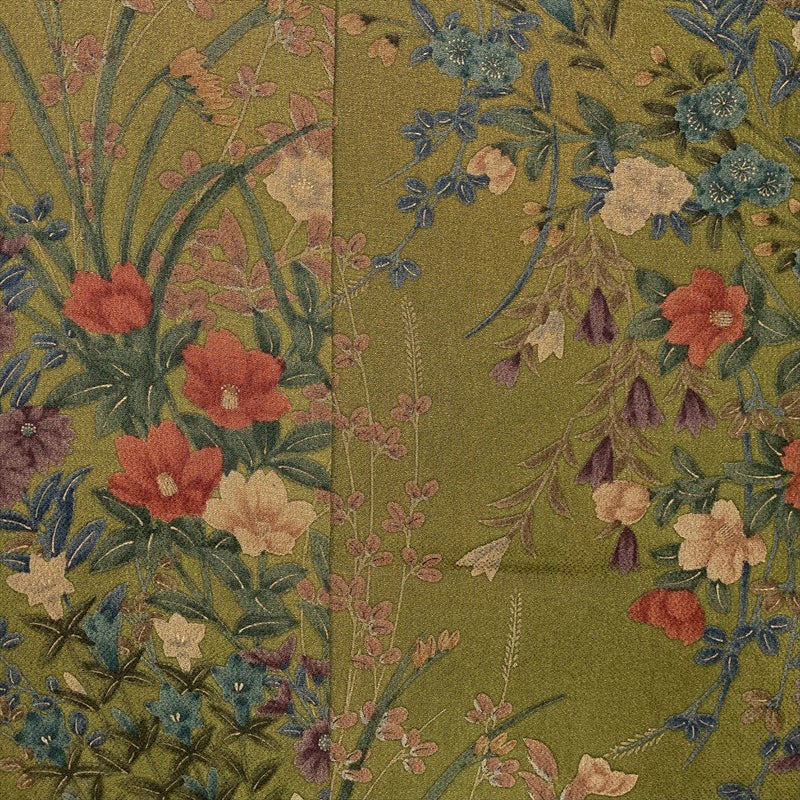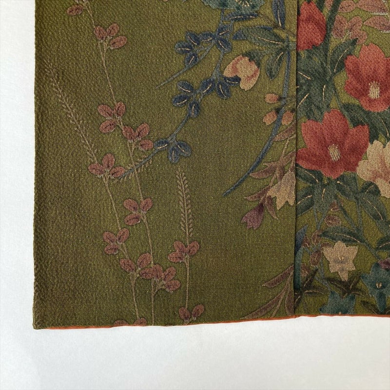 【色柄】カーキ色 ちりめん 四季花 未洗い 袷