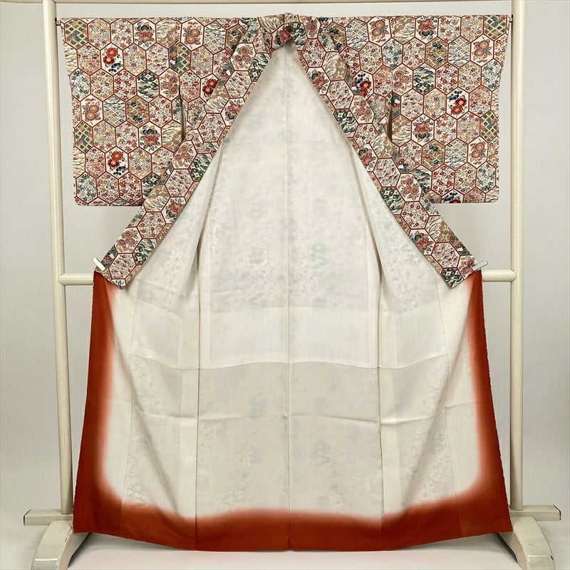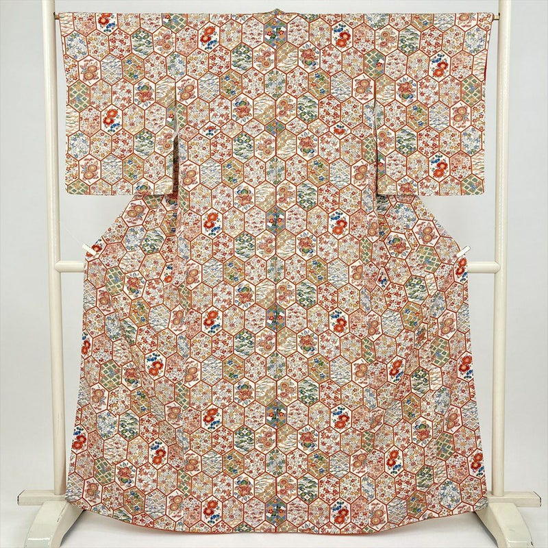 (中古) 小紋 白 柿色 オレンジ カジュアル 亀甲 四季花 吉祥文 袷 絹【身丈】160cm【裄丈】67cm