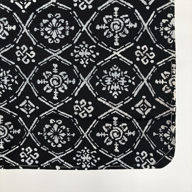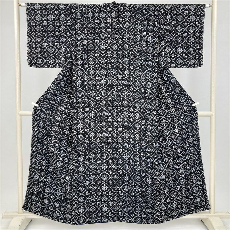 深い鉄紺に、ろうけつ染め調の味わい深い表情が映える小紋です。