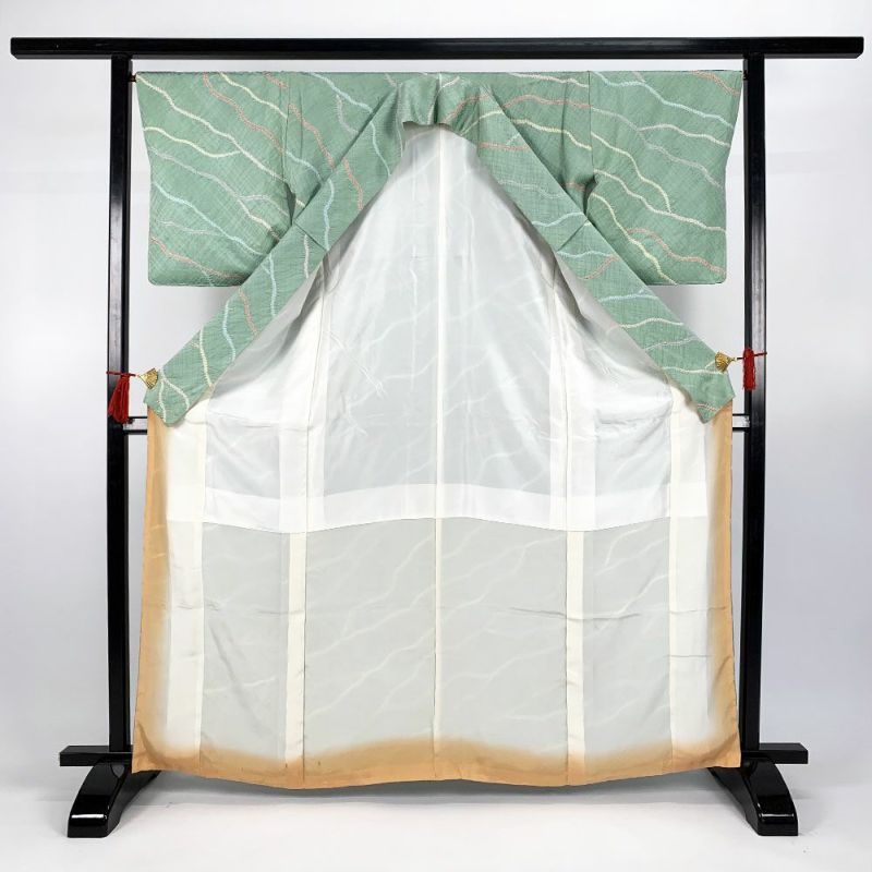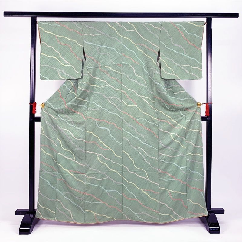(中古)小紋 緑 カジュアル 地紋織り 絞り 袷 M【身丈】161.5cm【裄丈】68.5cm