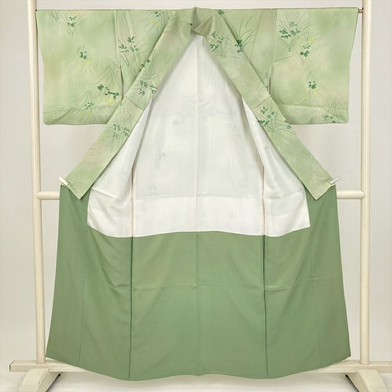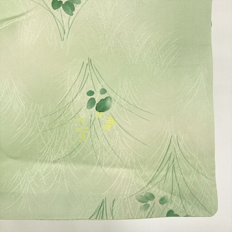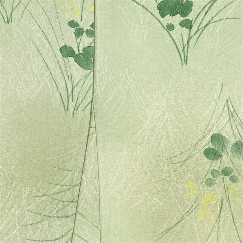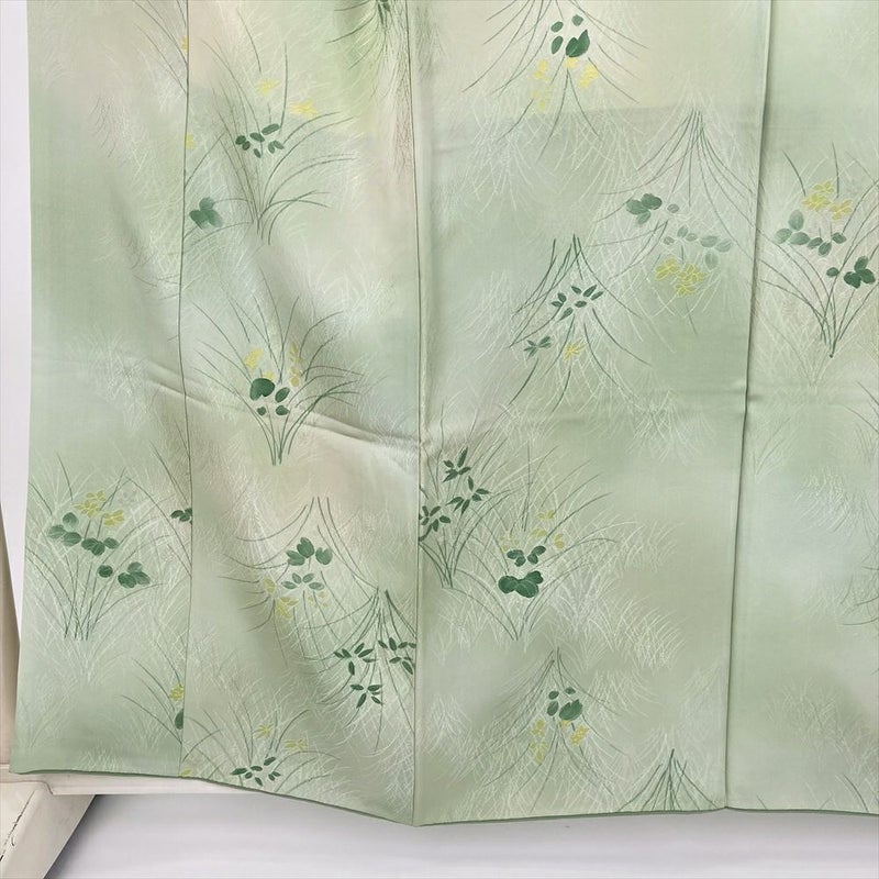 (中古) 小紋 薄緑 カジュアル 草花文 袷 絹【身丈】153.5cm【裄丈】66cm