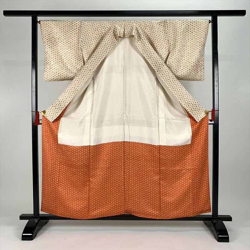 (中古)小紋 カジュアル ベージュ 袷 地紋織り 小花 亀甲 未洗い S【身丈】155cm 【裄丈】66cm