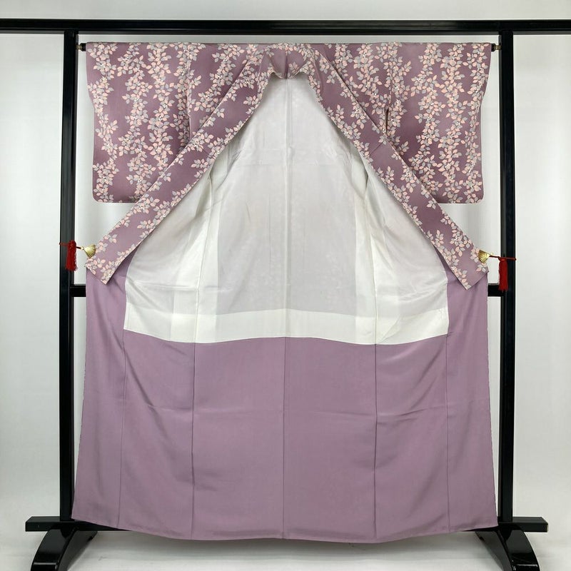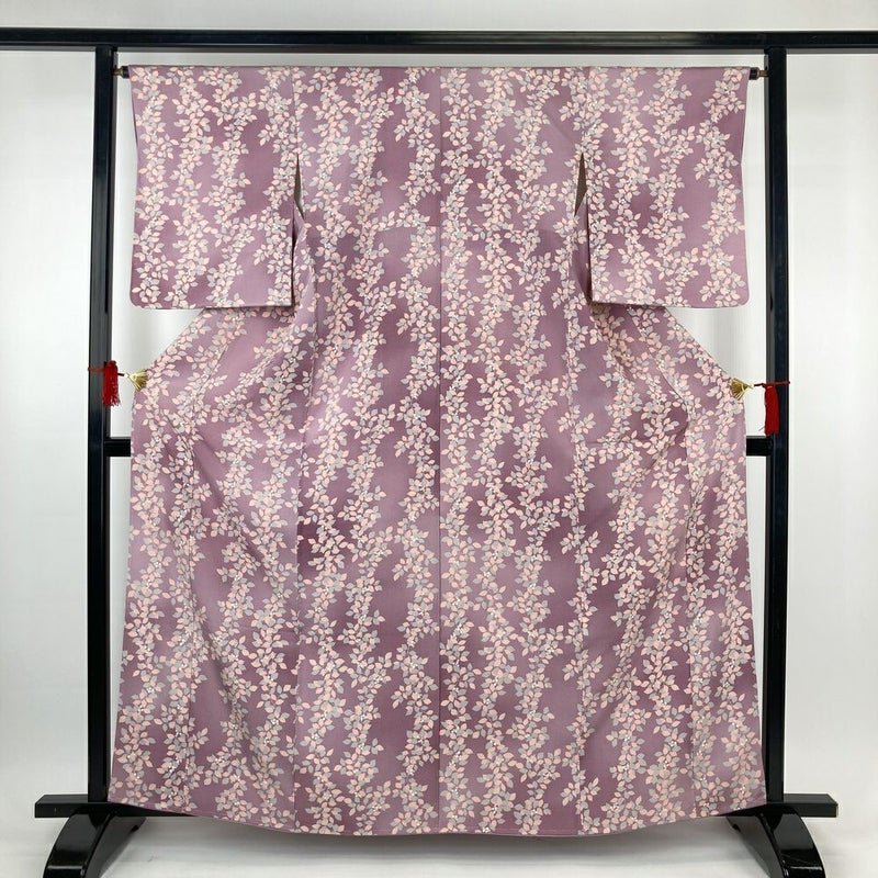 (中古)小紋 紫 ちりめん ぼかし染め 実と葉 袷 S【身丈】158cm 【裄丈】63.5cm