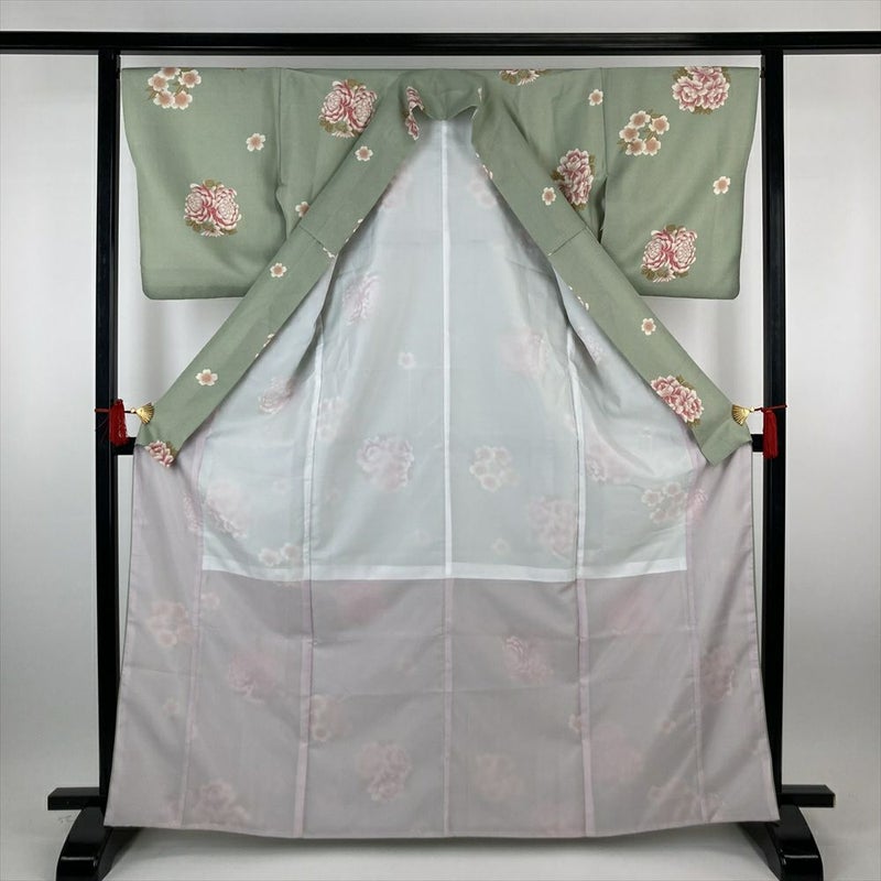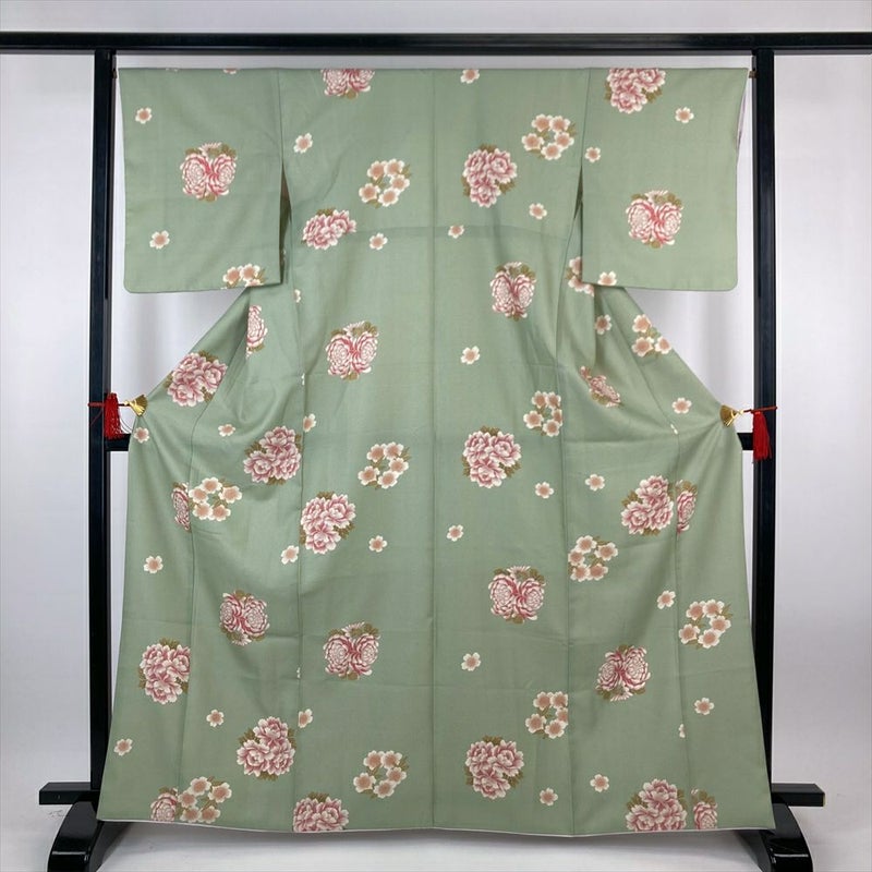 (中古)小紋 緑 ポリエステル 牡丹 菊 桜 袷 M【身丈】162cm 【裄丈】66cm