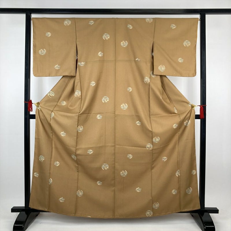 モダンでレトロな印象のお着物です。カジュアルシーン向けです。普段使いに、ちょっとしたお出かけに、お好きなコーディネートをお楽しみくださいませ。ポリエステル100%のタグあり。