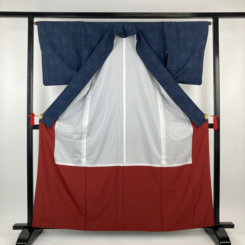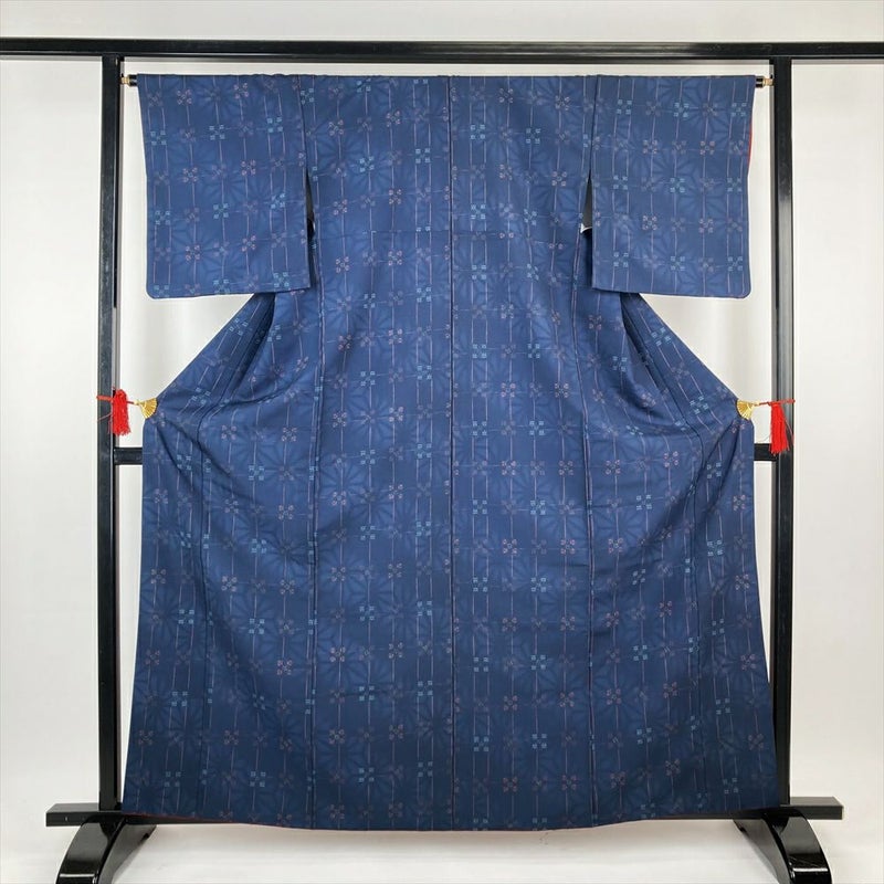(中古)江戸小紋 紺 ポリエステル 洗える ちりめん調 変わり格子 七宝 麻の葉 袷 S【身丈】158cm 【裄丈】64cm
