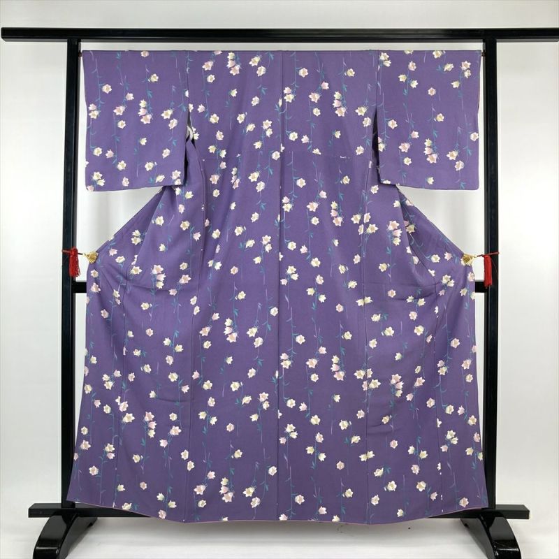 (中古)小紋 紫 カジュアル ちりめん 花 胴裏ポリエステル スナップあり 引き糸あり 袷 S【身丈】158cm【裄丈】67.5cm