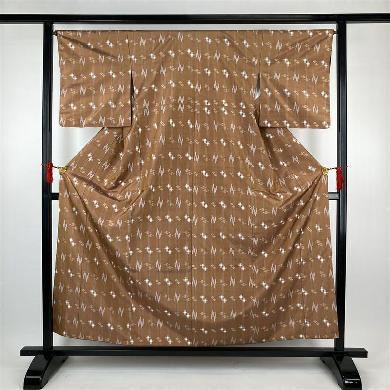 (中古)小紋 薄茶 カジュアル 紬地 変わり縞 鳥 井戸 水 風 袷 SS【身丈】154cm【裄丈】66.5cm