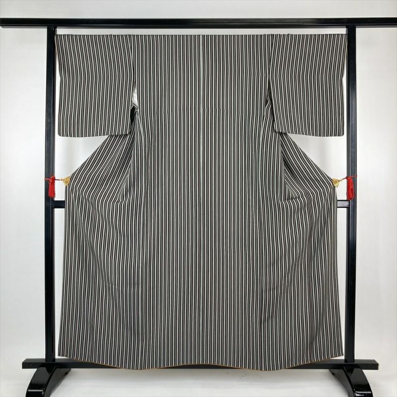 (中古)小紋 黒 カジュアル ちりめん 変わり縞 袷 SS【身丈】154.5cm【裄丈】69.5cm