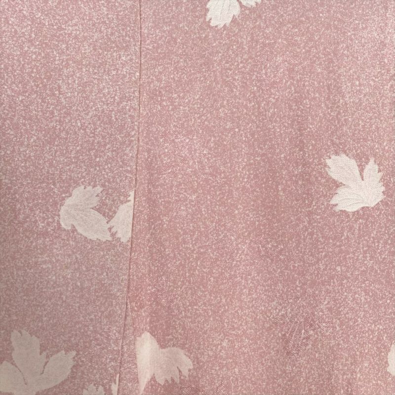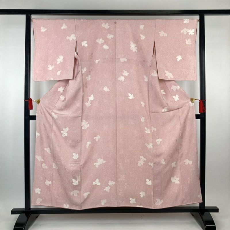 (中古)小紋 薄ピンク セミフォーマル 一つ紋 地紋織り たたき染め シルエット 梶の葉 袷 SS【身丈】152.5cm【裄丈】67.5cm