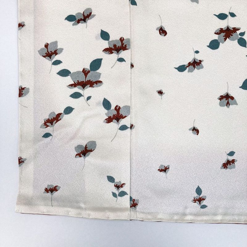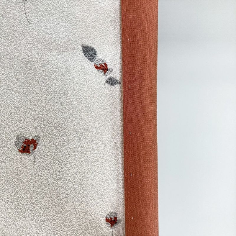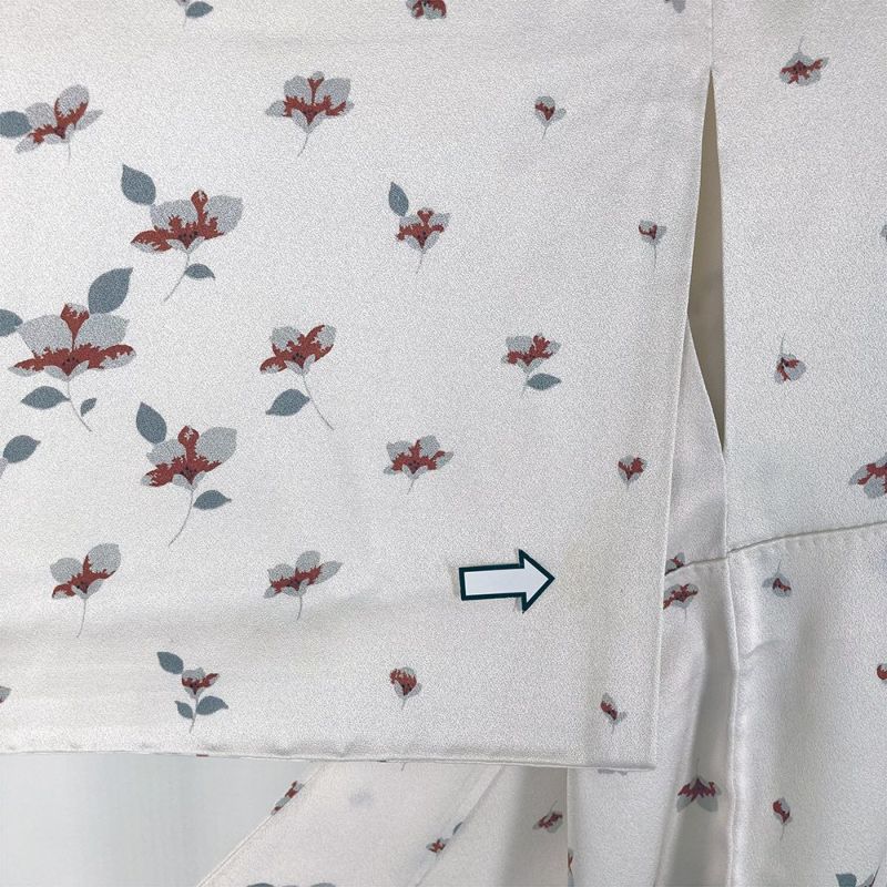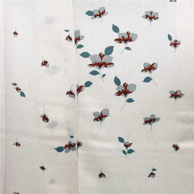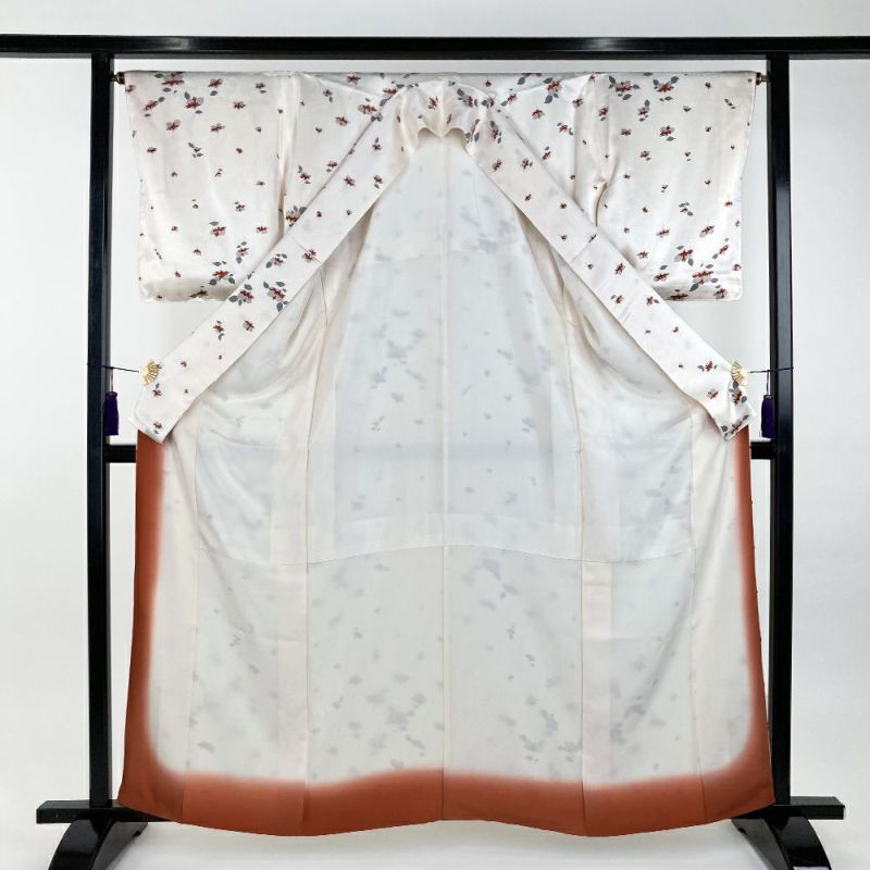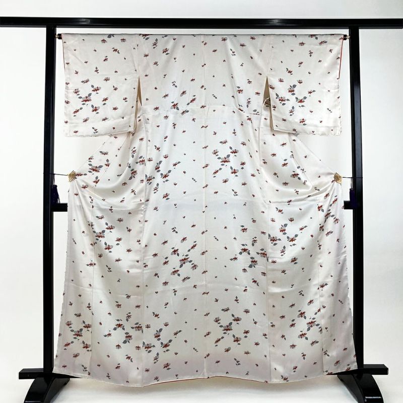 桜であろう花のつぼみが、徐々に咲いていく過程を斜めに並べた生成り地の小紋です。しとやかな印象で巾広いシーンでお使いいただけます。左後袖に汚れが見られます。
