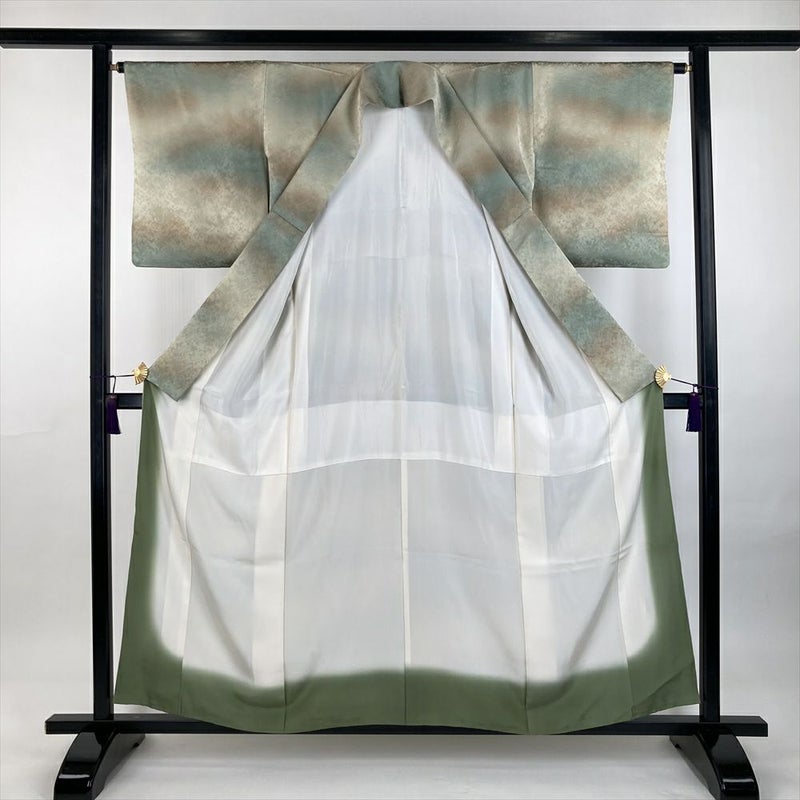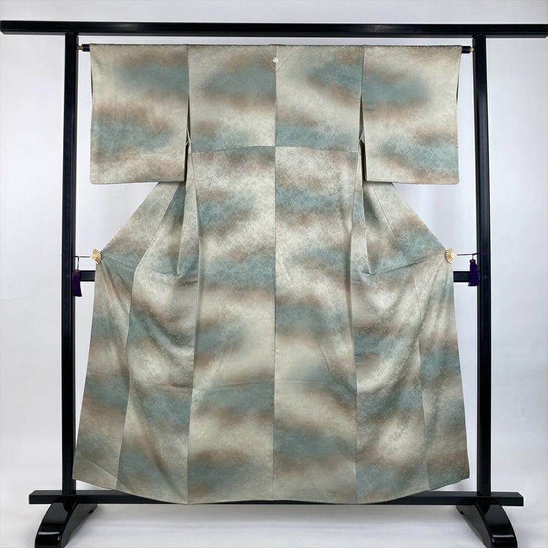 (中古) 小紋 灰緑 灰茶 カジュアル 地紋織り 染め グラデーション 袷 SS【身丈】154cm【裄丈】63cm