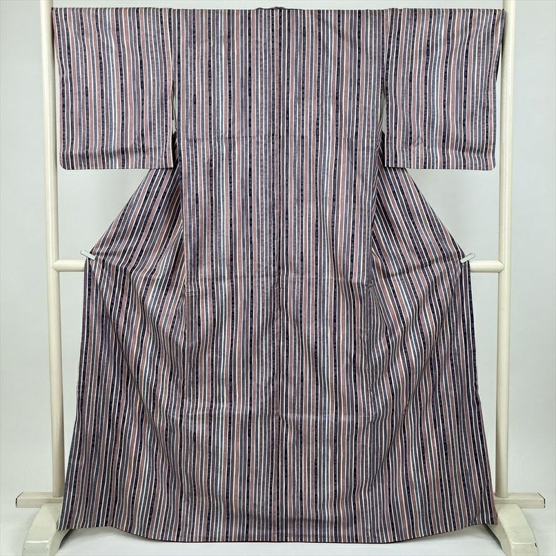 (中古) 小紋 紫 カジュアル 紬地 変わり縞 ろうけつ調 袷 絹【身丈】162cm【裄丈】68.5cm