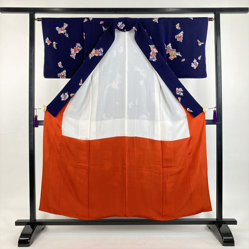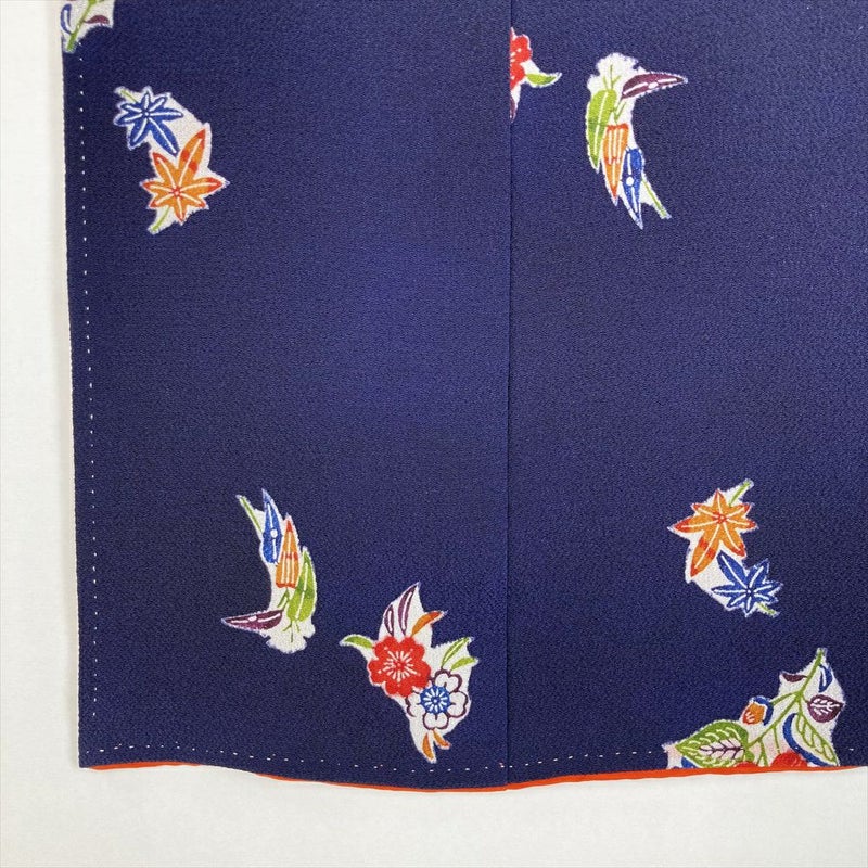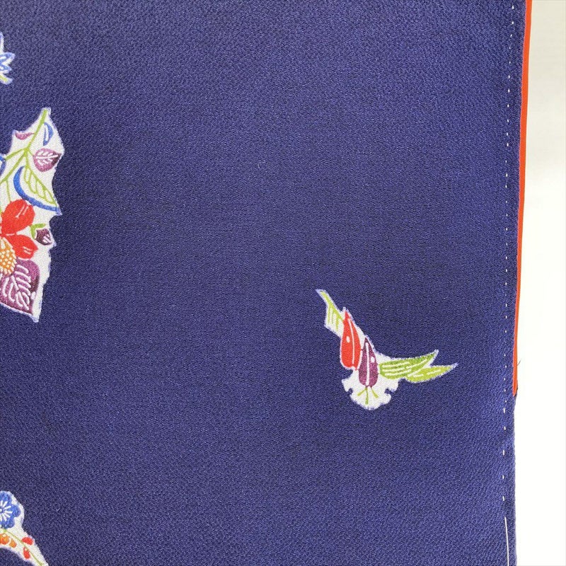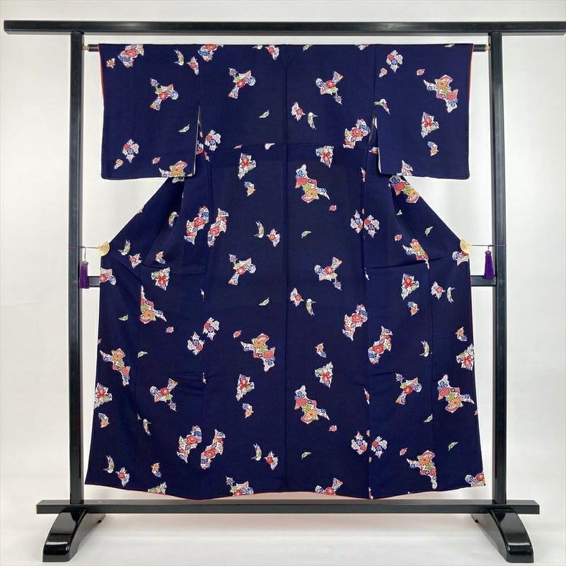 (中古) 小紋 紺 カジュアル ちりめん 染め 紅型調 四季花 袷 SS【身丈】151cm【裄丈】62.5cm