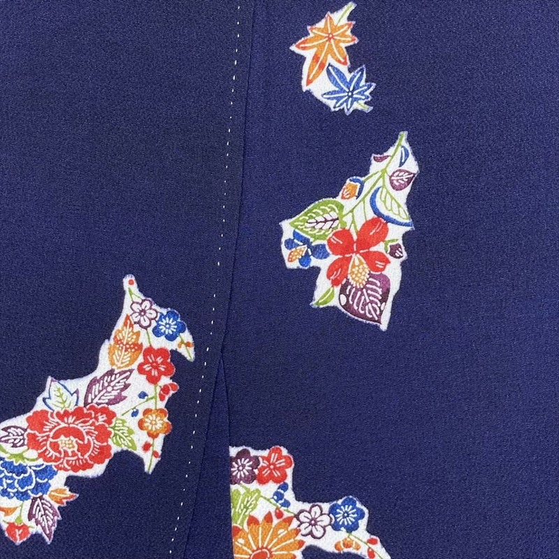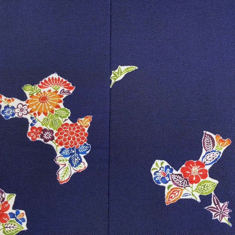 【色柄】紺 カジュアル ちりめん 染め 紅型調 四季花
