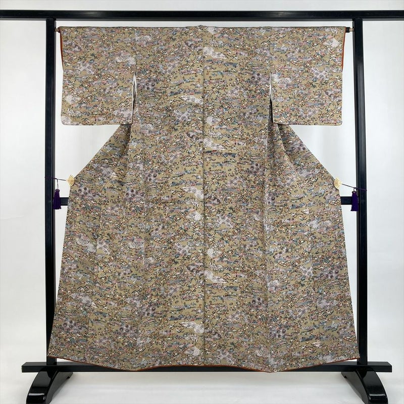 (中古) 小紋 サンドベージュ カジュアル ちりめん 染め 切り嵌め 古い町並み 風景 袷 SS【身丈】150.5cm【裄丈】64cm