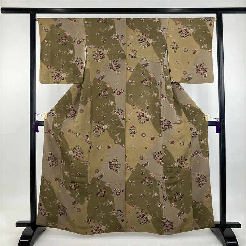 (中古) 小紋 柳茶 カーキ 緑 カジュアル ちりめん 染め 割り付け 唐花 袷 S【身丈】159cm【裄丈】67cm