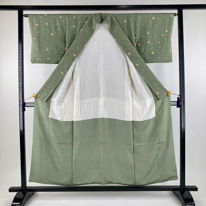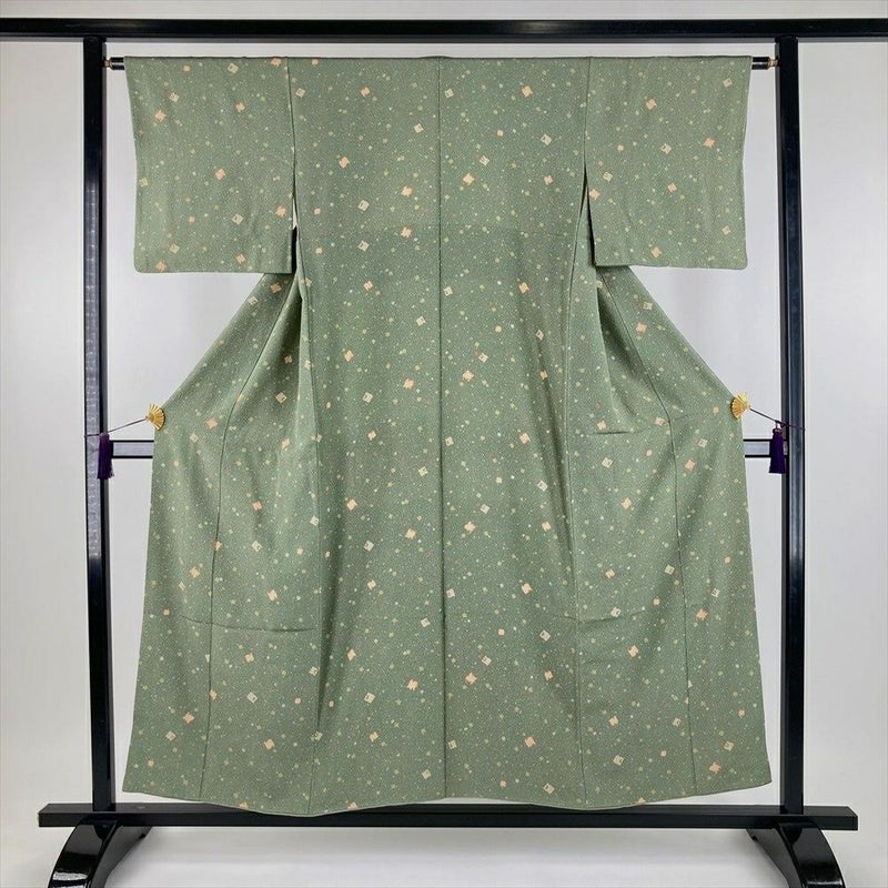 (中古) 小紋 青磁色 緑系 カジュアル ちりめん 破れ色紙 紅葉 鹿の子 霰 袷 SS 【身丈】148.5cm【裄丈】64cm
