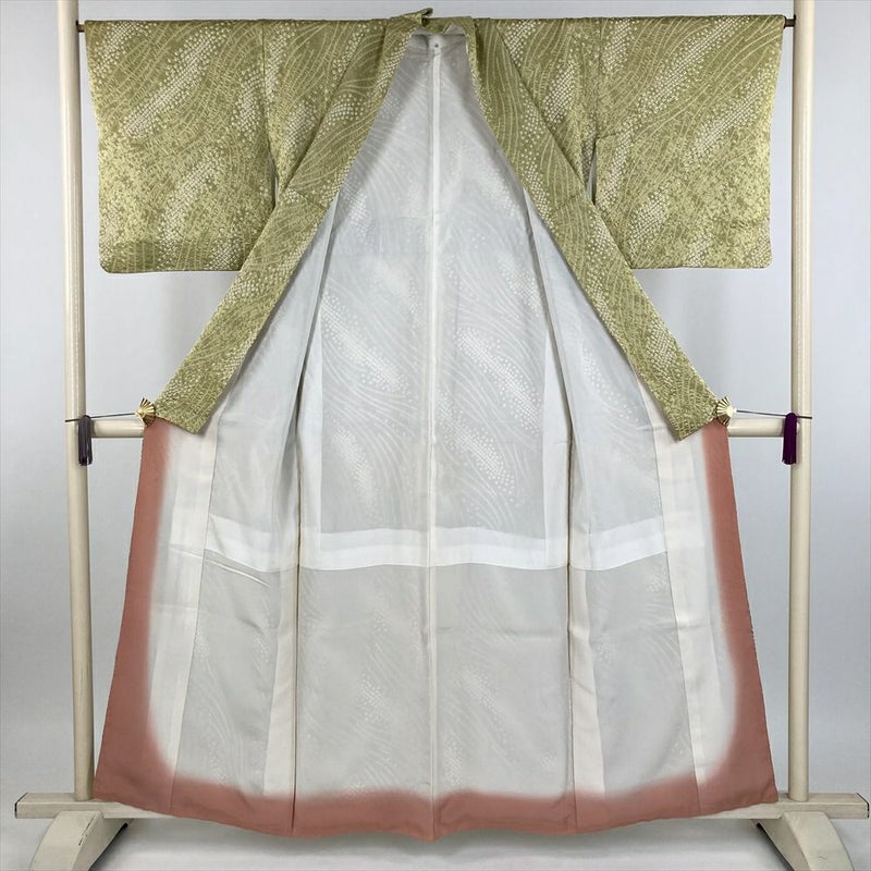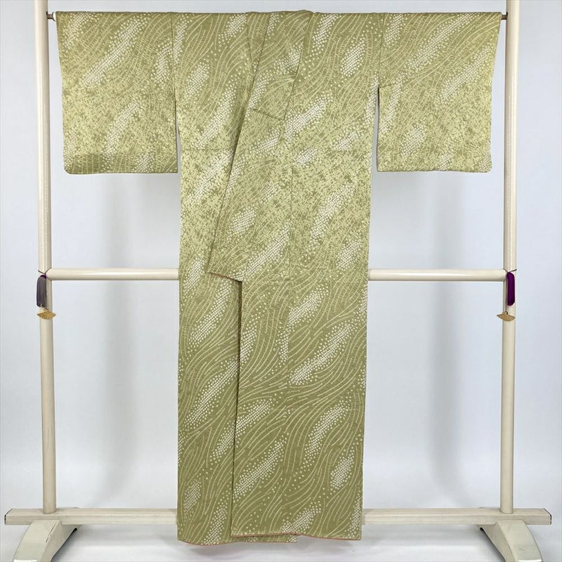 (中古) 小紋 緑 抹茶色 カジュアル 地紋織り 染め 鹿の子絞り 袷 絹【身丈】153cm【裄丈】66.5cm
