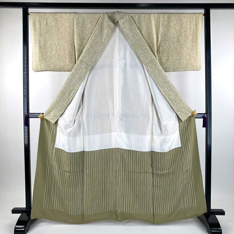小紋は、普段着からおしゃれ着として比較的カジュアルなシーンで幅広くお使いいただけるお着物です。デザイン性が豊かで、生地はやわらかい物からかたい物までさまざまですが、表面にはひかえめな光沢がございます。リユース品ですが、まだ十分ご愛用いただけると存じます。保存臭がややございます。