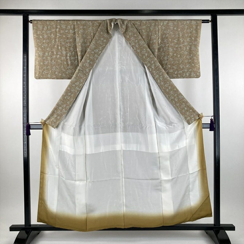 (中古) 小紋 灰茶色 ベージュ系 カジュアル ちりめん 破れ亀甲 四季花 家屋 袷 SS 【身丈】152.5cm【裄丈】62.5cm