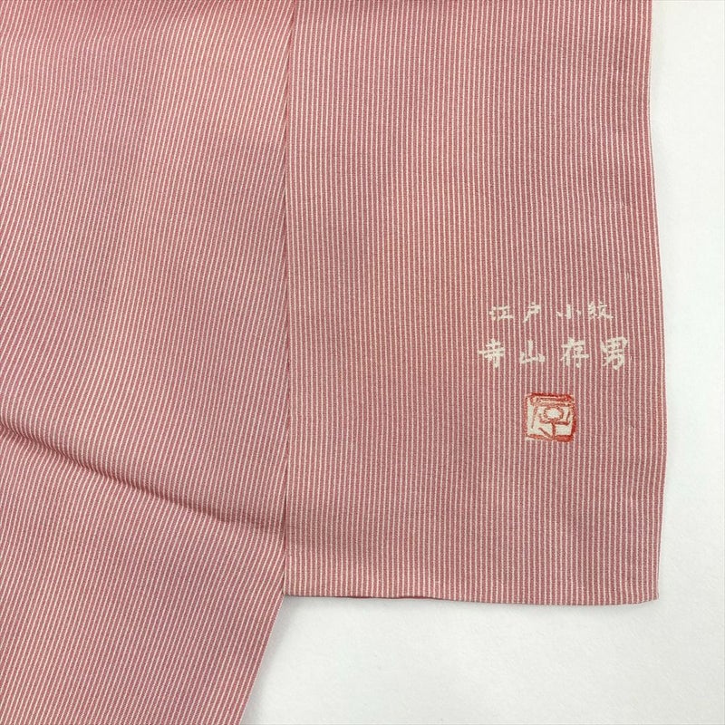 小紋は、普段着からおしゃれ着として比較的カジュアルなシーンで幅広くお使いいただけるお着物です。デザイン性が豊かで、生地はやわらかい物からかたい物までさまざまですが、表面にはひかえめな光沢がございます。リユース品ですが、まだ十分ご愛用いただけると存じます。保存臭がややございます。衿先に落款がございます「江戸小紋寺山在夫」
