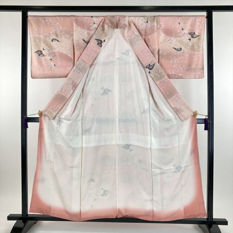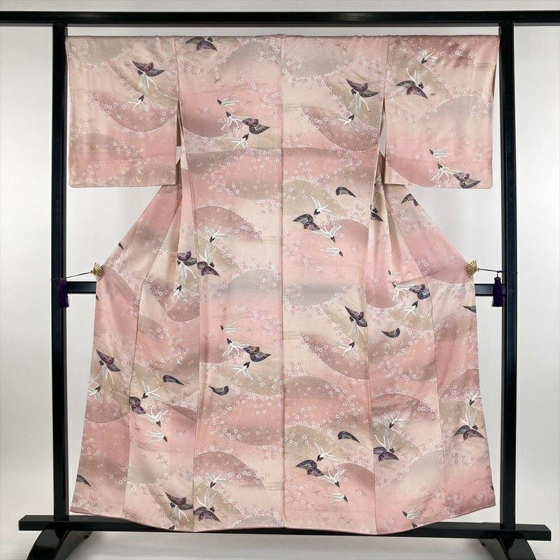 (中古) 小紋 ピンク色 カジュアル 地紋織り 花鳥 流水 源氏車 袷 SS 【身丈】151.5cm【裄丈】68cm