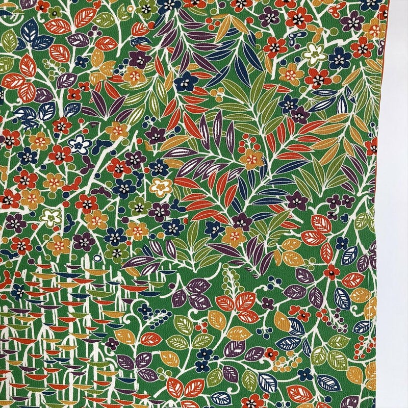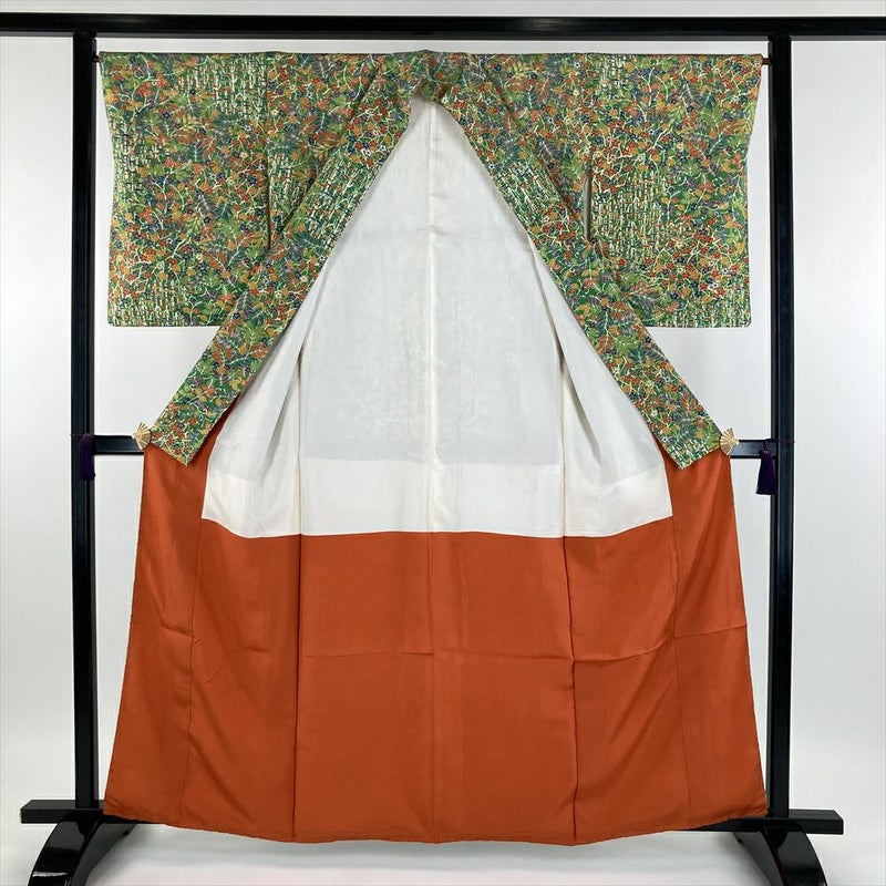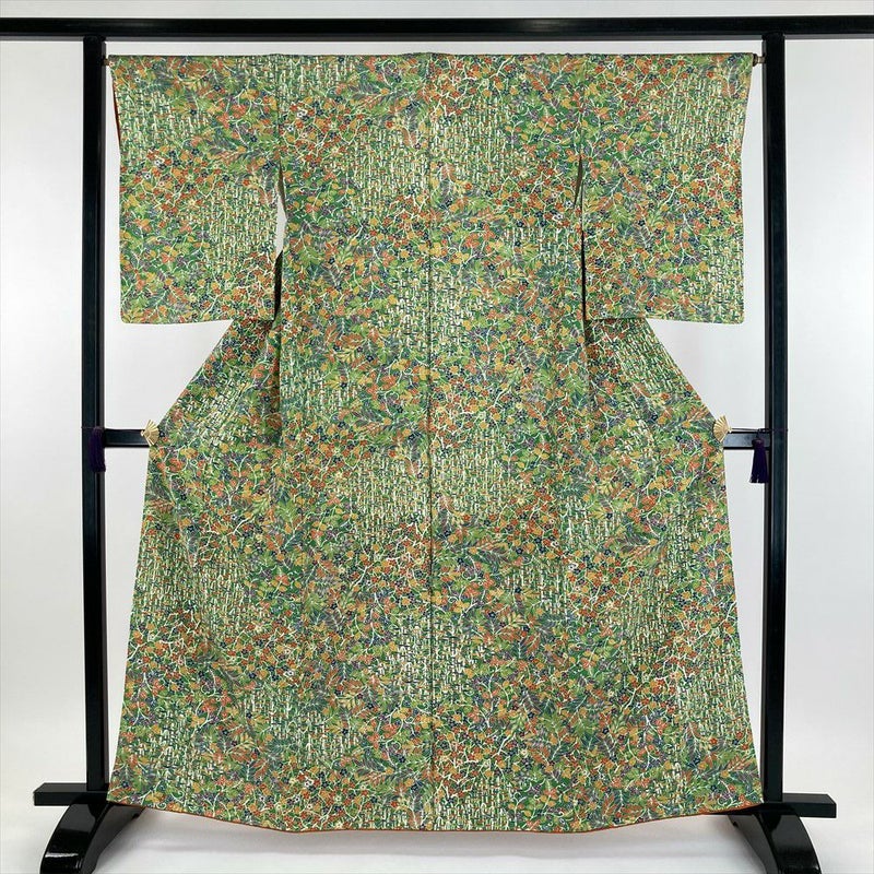 (中古) 小紋 緑色 カジュアル 植物 メルヘン調 袷 S【身丈】158cm【裄丈】66.5cm