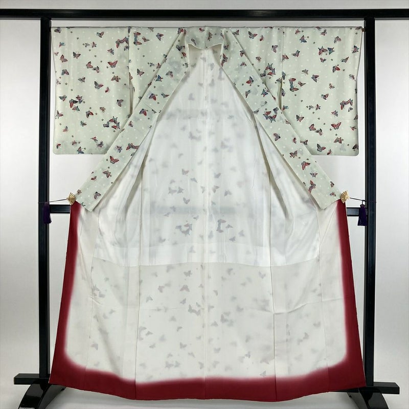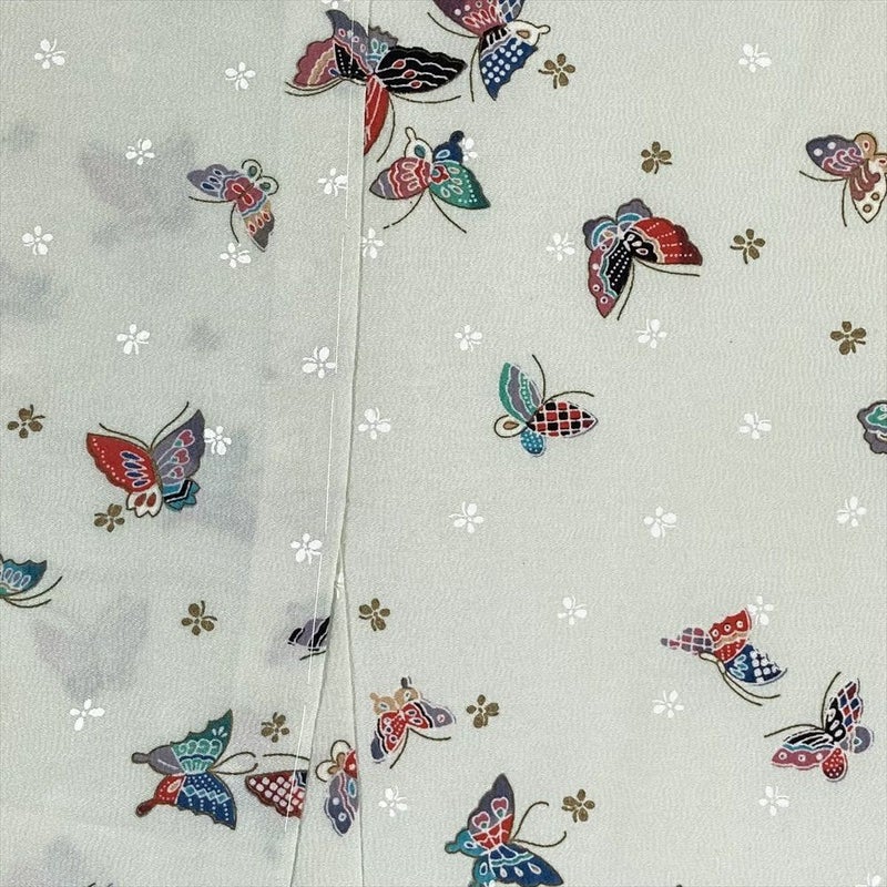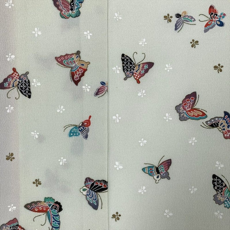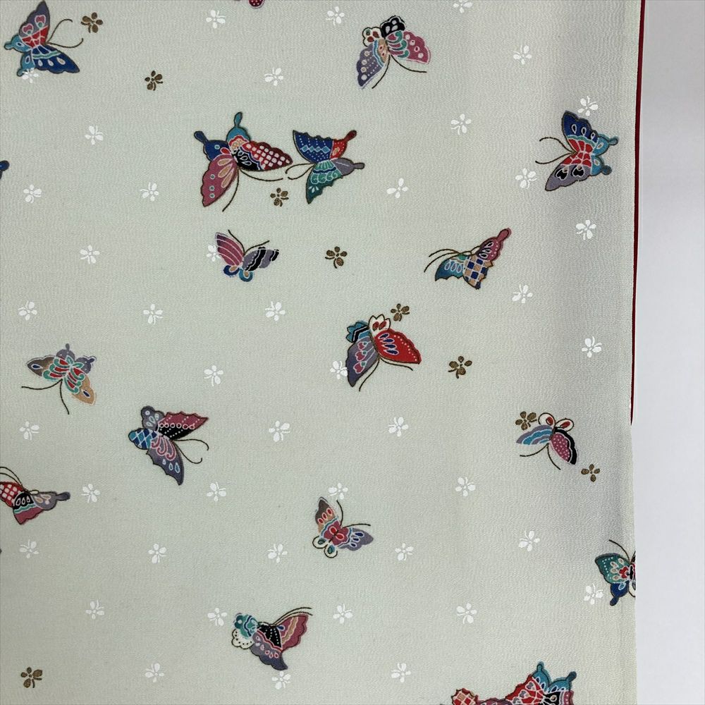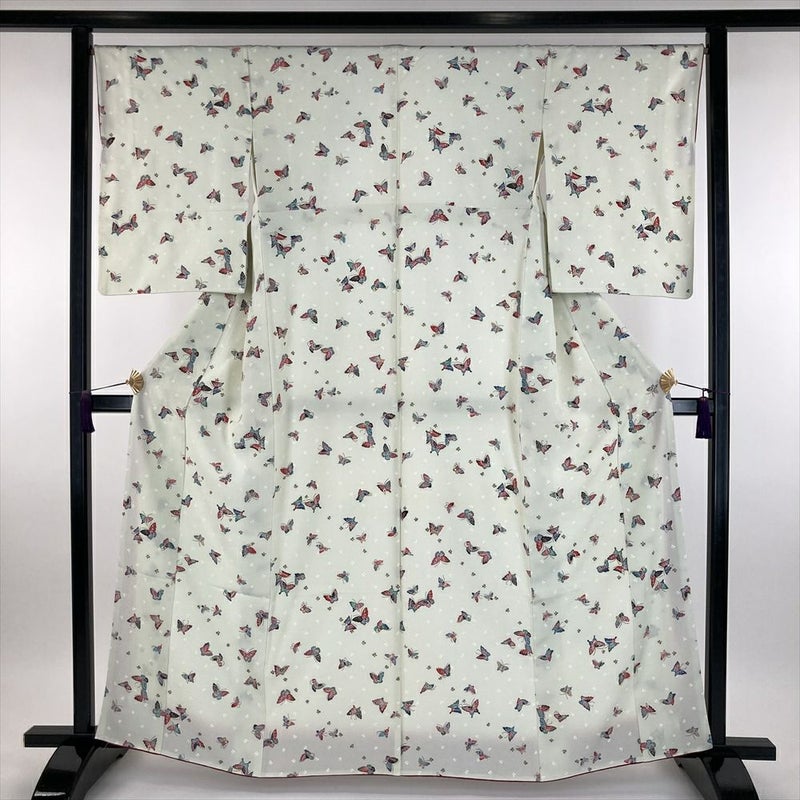 (中古) 小紋 白緑色 カジュアル 金彩 蝶 袷 M【身丈】160cm【裄丈】67.5cm