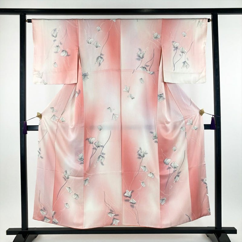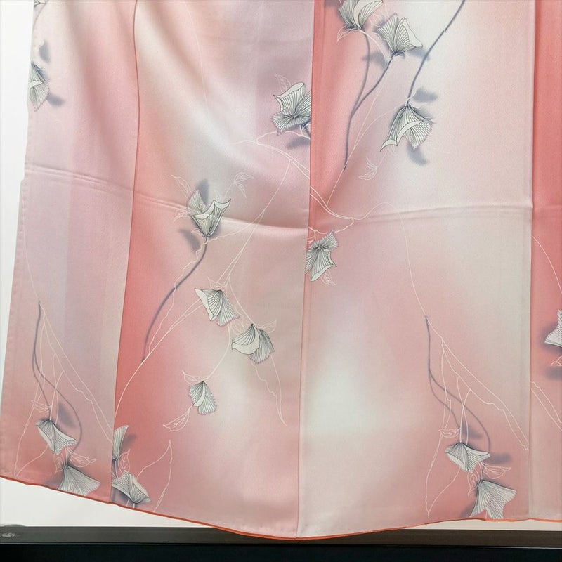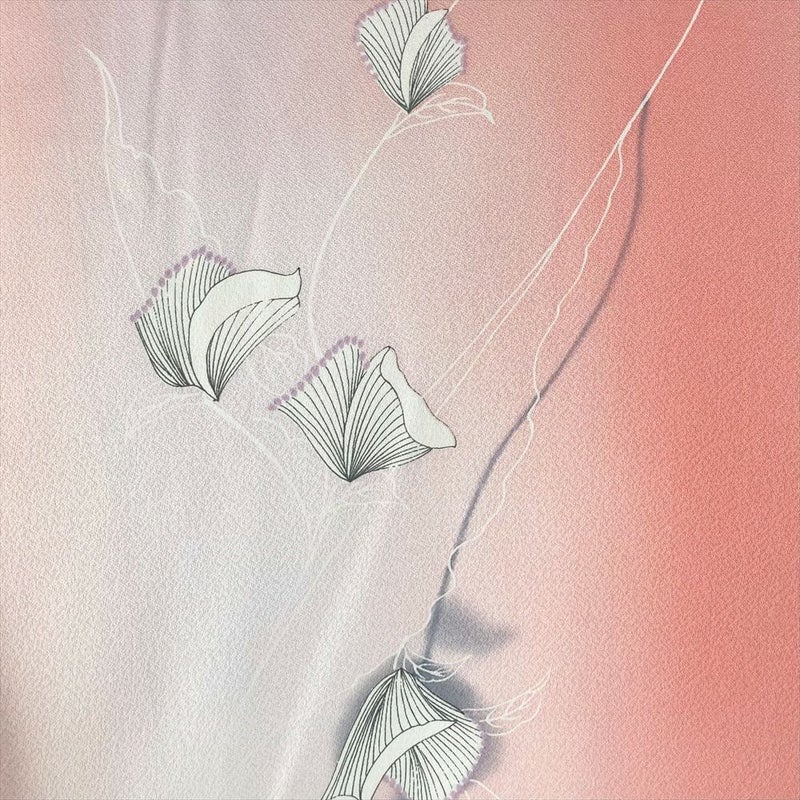 (中古) 小紋 白色 薄珊瑚色 ピンク カジュアル ぼかし染め 花 抽象柄 袷 SS 【身丈】149cm【裄丈】65cm