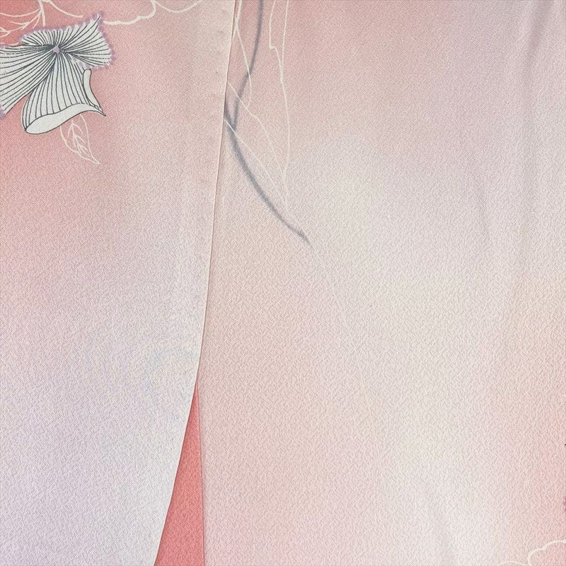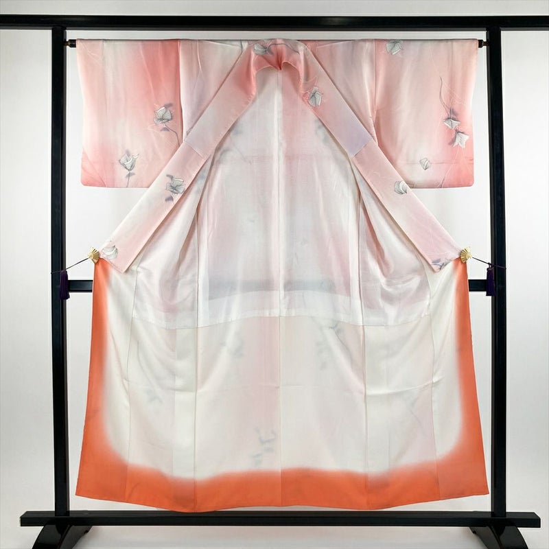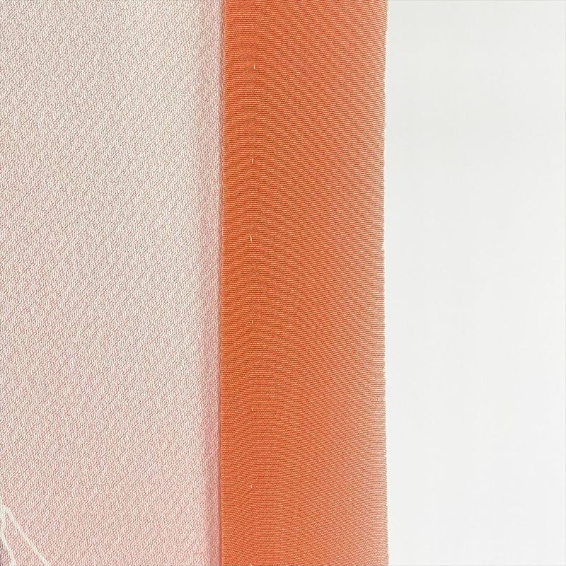 ぼかし染めの最大の特徴は、なんといってもその美しいグラデーションです。染料が濃淡を織りなすことで、奥行きと立体感、そして柔らかな印象を生み出します。淡いぼかしの着物には、淡い色やシンプルな柄の帯を合わせると、優しい雰囲気になります。深みのあるぼかしの着物には、深みのある色の帯や全通柄の帯を合わせると、華やかな印象になります。衿裏、胴裏に薄茶色のシミ汚れがございます。保存臭がややございます。