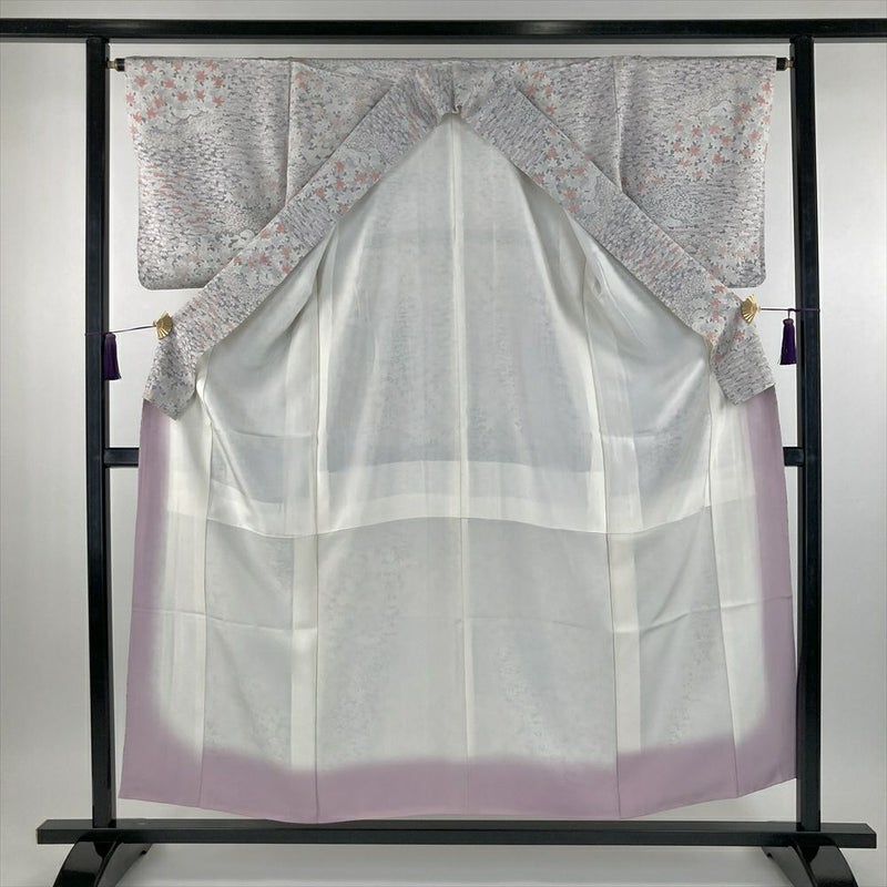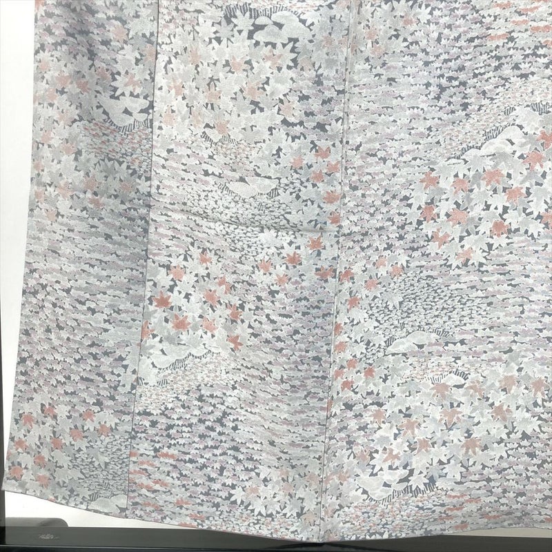 (中古) 小紋 薄灰色 薄グレー カジュアル 地紋織り 染め 笹 紅葉 袷 SS 【身丈】151cm【裄丈】65cm