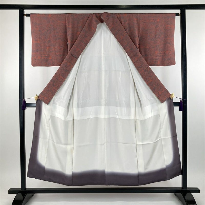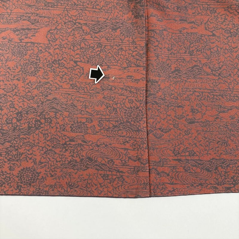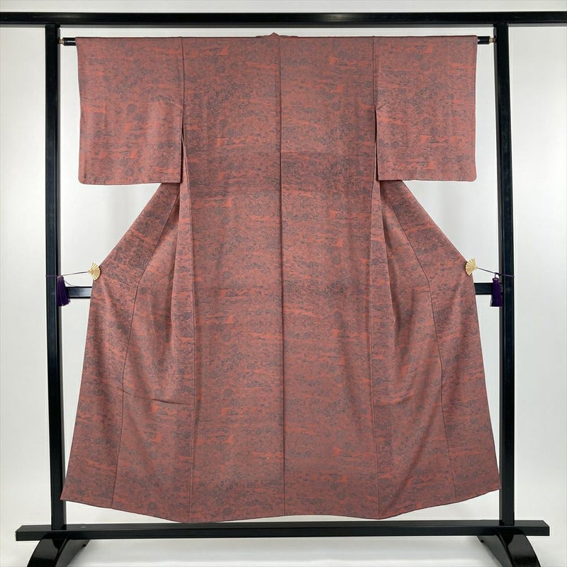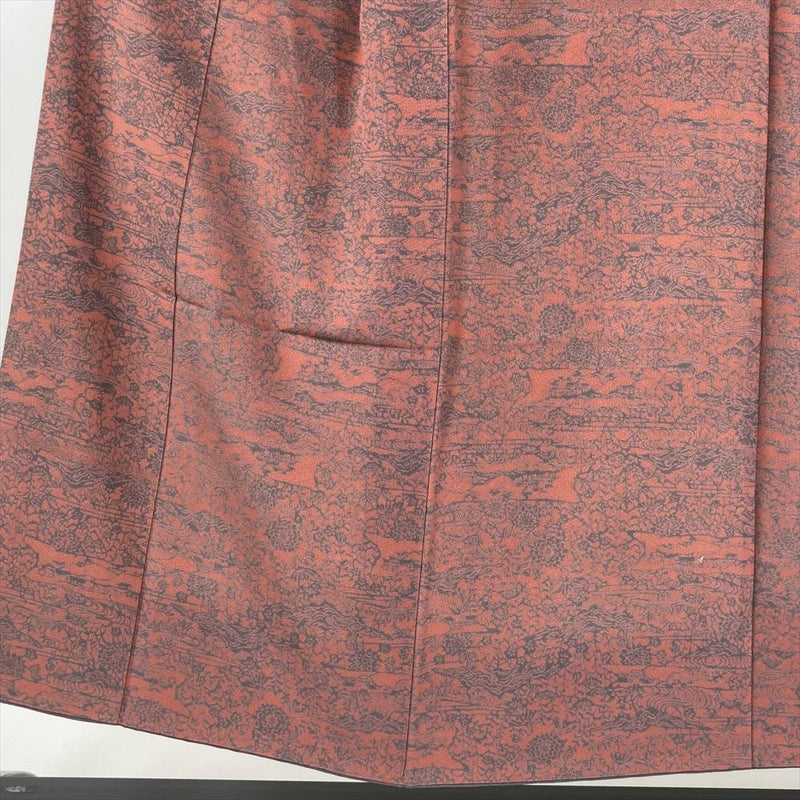 (中古) 小紋 珊瑚色 濃ピンク色 カジュアル ちりめん 染め 四季花 流水 袷 SS 【身丈】146cm【裄丈】62cm