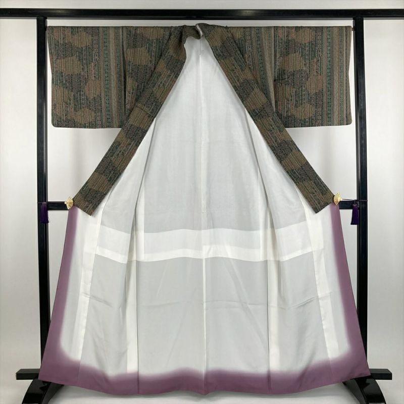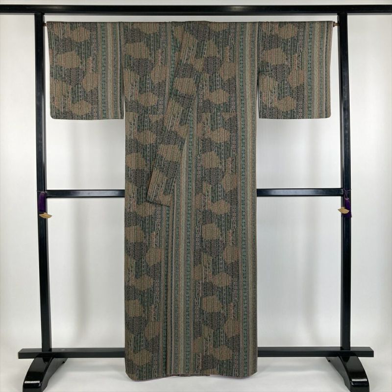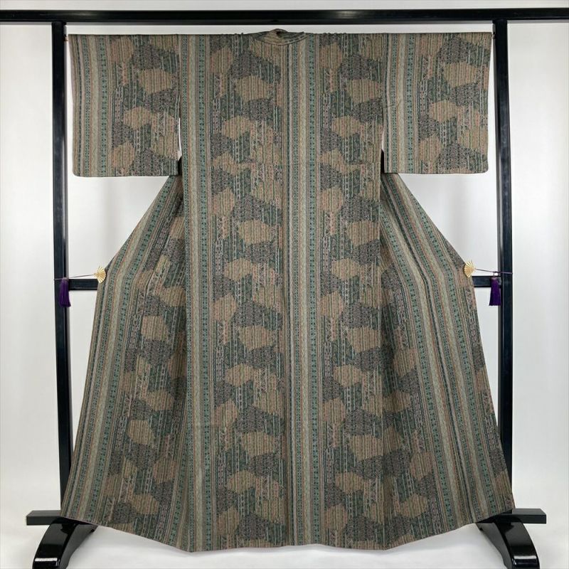 (中古) 小紋 濃緑色 カジュアル 染め 和更紗 オリエンタル 袷【身丈】157cm【裄丈】67cm
