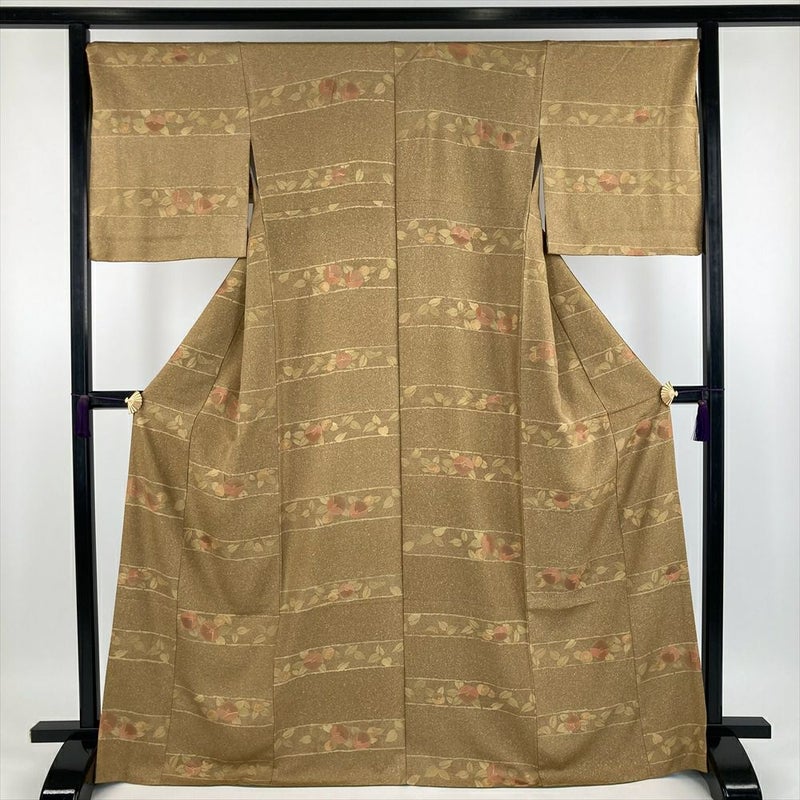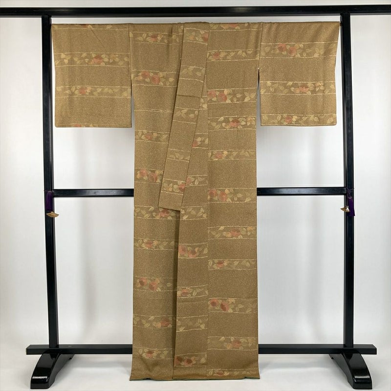 (中古) 小紋 黄色 芥子色 カジュアル 地紋織り 染め 金彩 椿 袷【身丈】165cm【裄丈】70.5cm