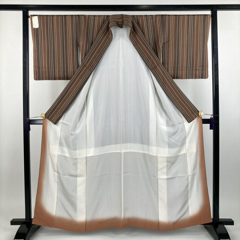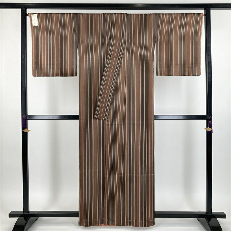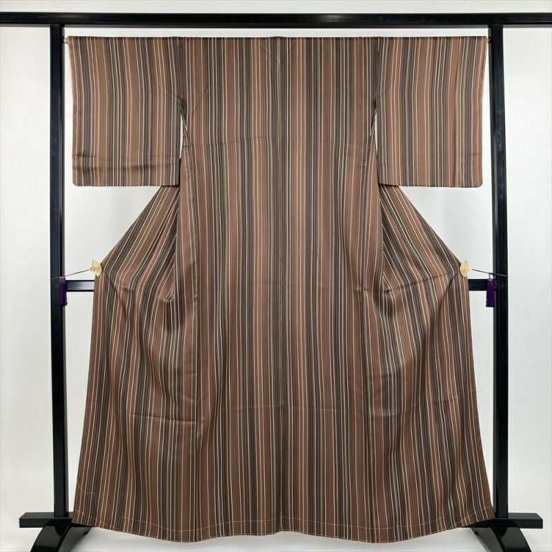 (中古) 小紋 茶色 カジュアル 地紋織り 染め 変わり縞 袷【身丈】156.5cm【裄丈】67.5cm