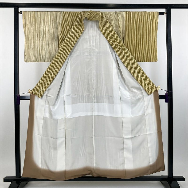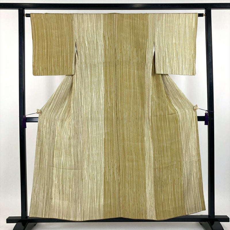 (中古) 小紋 芥子色 黄色 カジュアル ちりめん 染め 変わり縞 袷 【身丈】152.5cm【裄丈】64cm