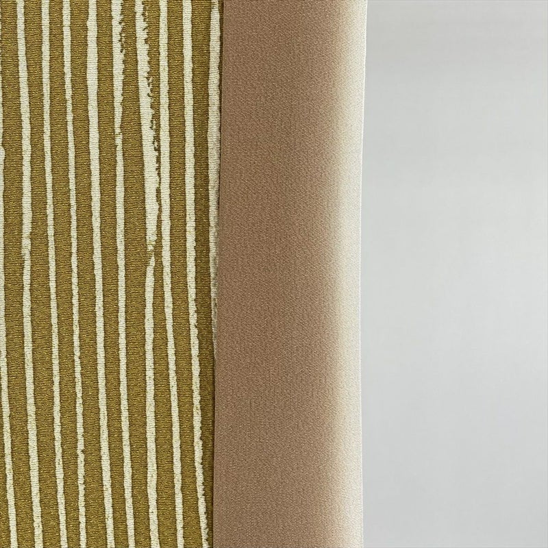 しっとりとした肌触りの上質なちりめん生地に、どこか懐かしい白抜きの変わり縞が映える芥子色の小紋。伝統的な染めの技法が織りなす、奥深い色合いと洗練されたデザインが魅力です。