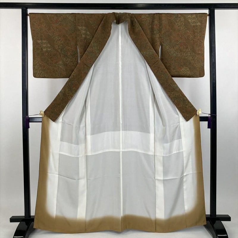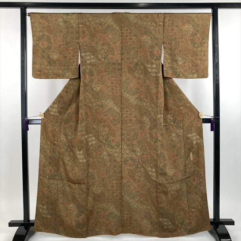 (中古) 小紋 茶色 カジュアル ちりめん 染め 鳳凰 唐草 青海波 袷 【身丈】158.5cm【裄丈】67cm