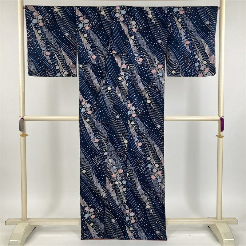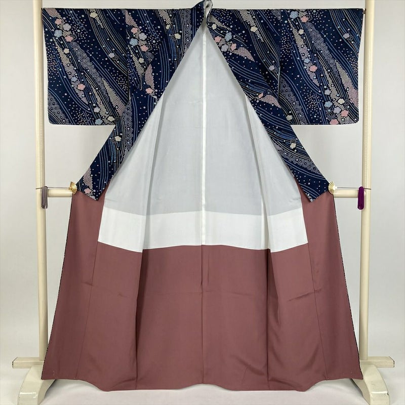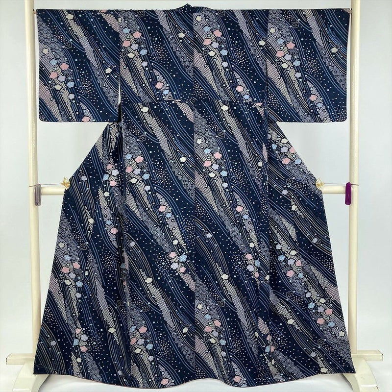 (中古) 小紋 紺色 カジュアル 地紋織り 染め 鹿の子柄 袷 絹【身丈】158cm【裄丈】67.5cm