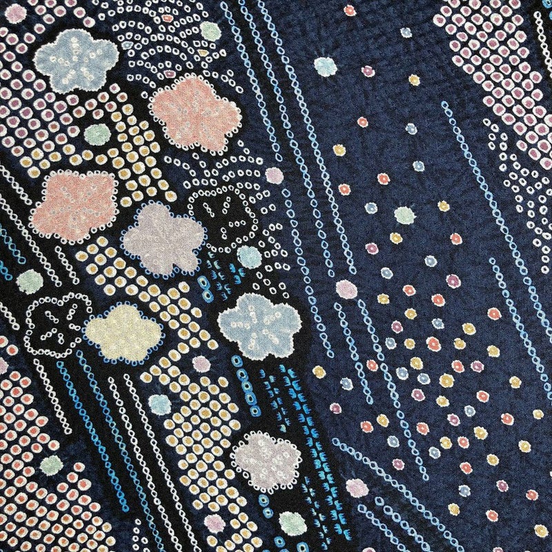 深みのある紺色の地色に、可憐な花々が咲き誇る愛らしいデザイン。