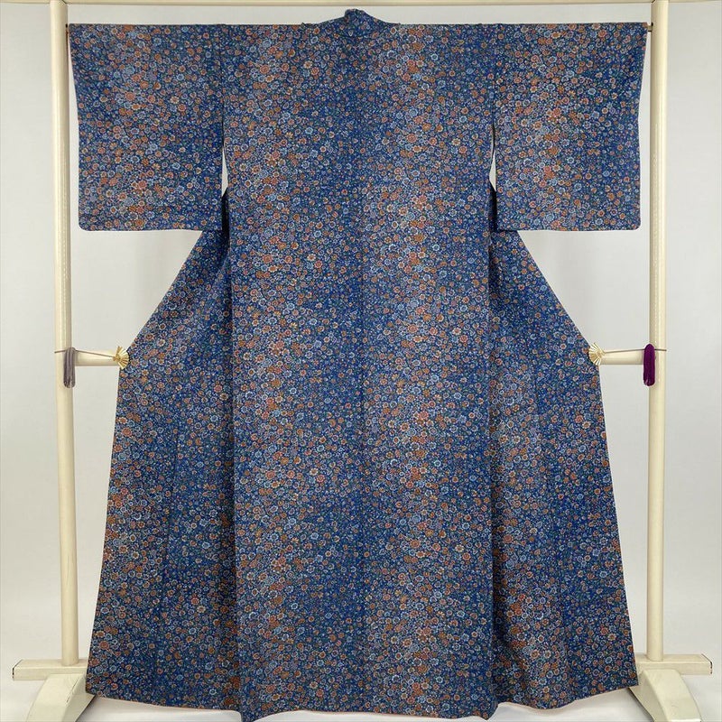 (中古) 小紋 青 藍色 カジュアル ちりめん 染め 花柄 袷 絹【身丈】157cm【裄丈】67.5cm