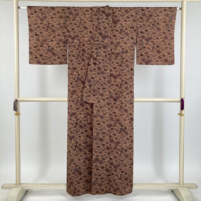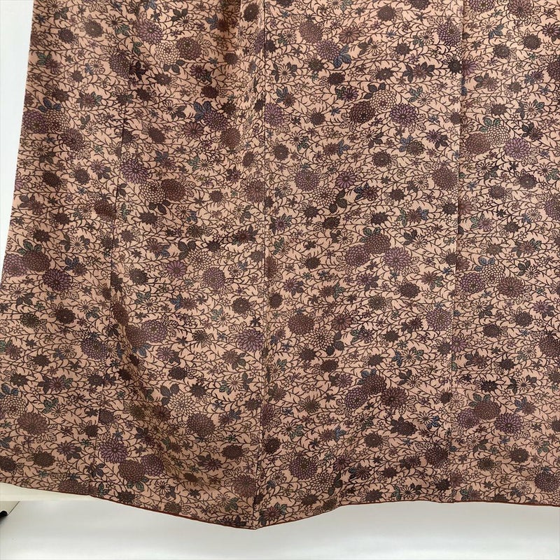 (中古) 小紋 水柿色 ピンクベージュ カジュアル 南部幸雄 ちりめん 染め 菊 袷 絹【身丈】153cm【裄丈】62.5cm
