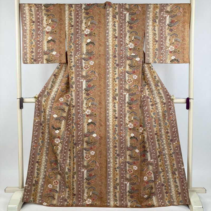 (中古) 小紋 オレンジ 赤朽葉色 カジュアル 地紋織り 染め 金彩 花蝶 袷 絹【身丈】160cm【裄丈】70cm