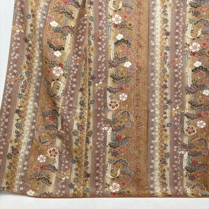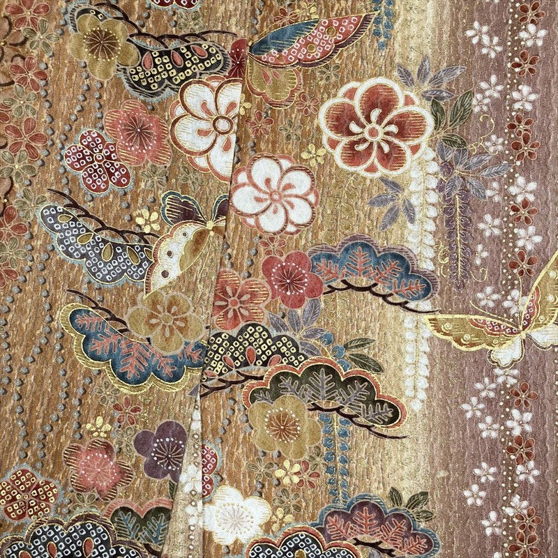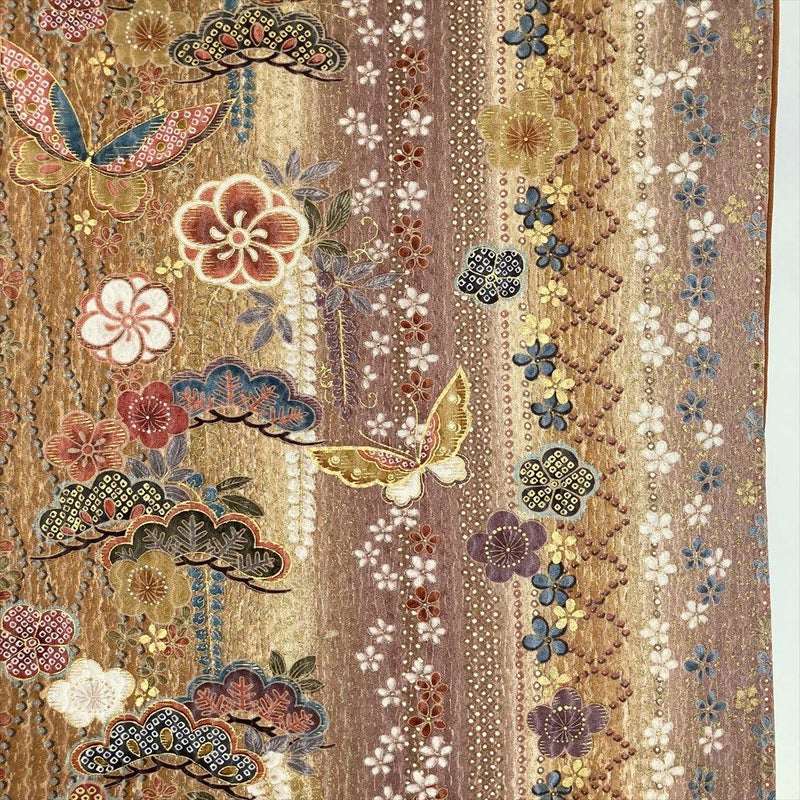 地紋織りの上質な生地に、染めと金彩で描かれた花蝶柄は、上品で可愛らしい印象。