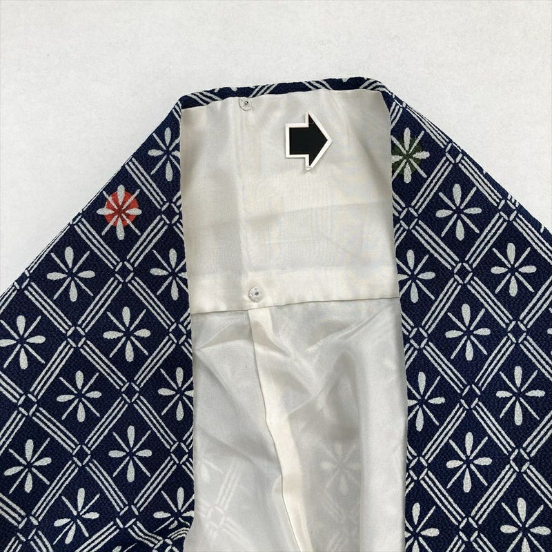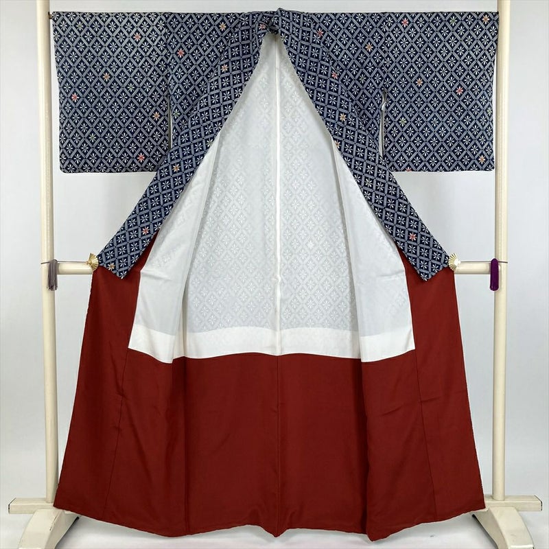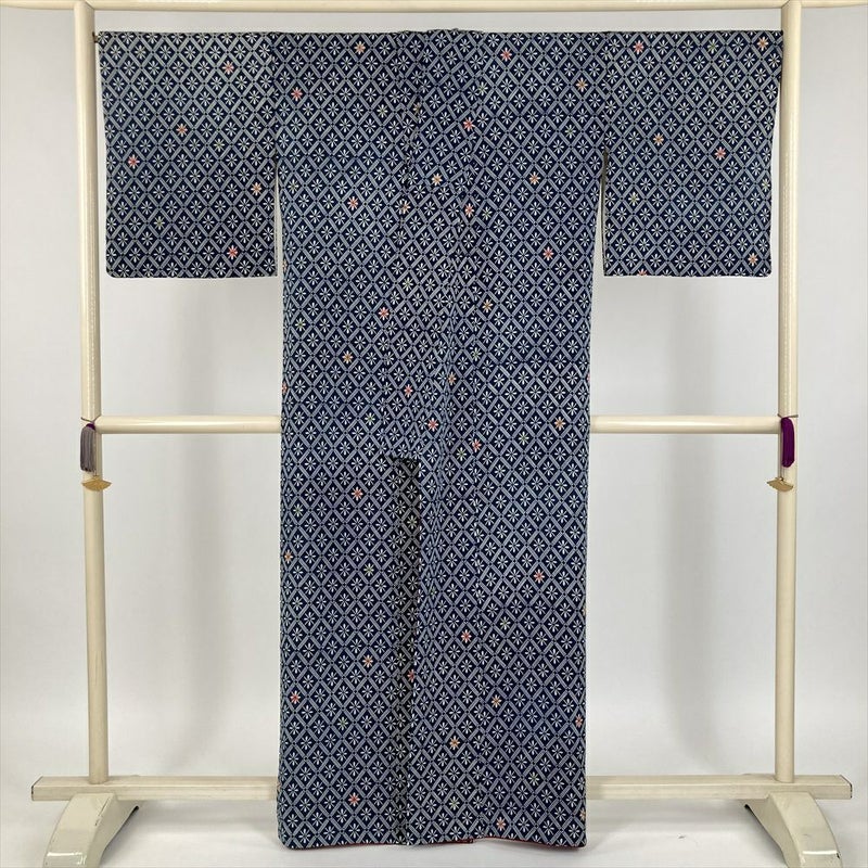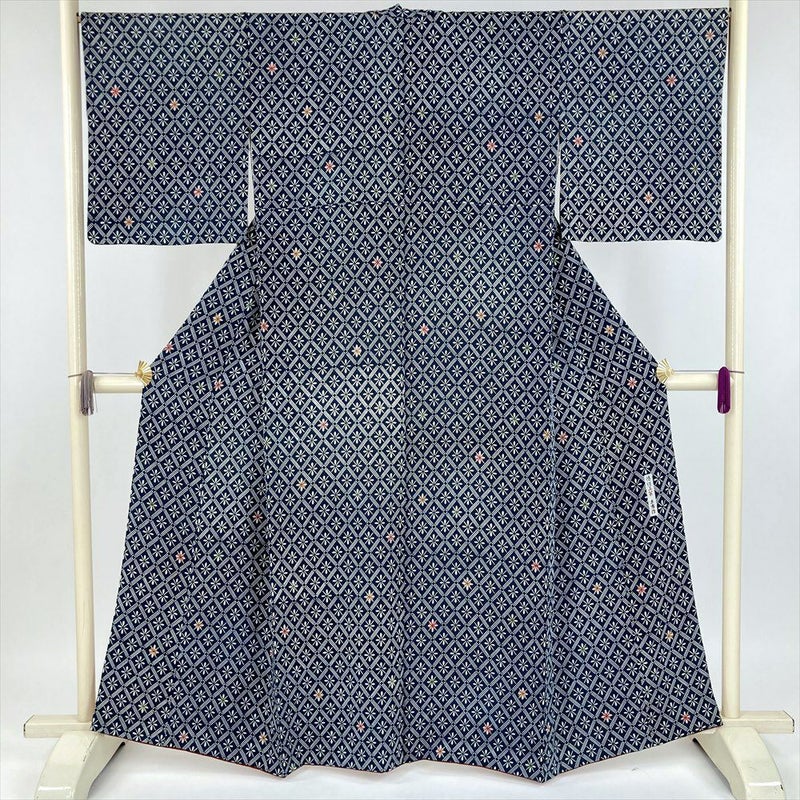 (中古) 小紋 紺色 カジュアル 伝統工芸土方 ちりめん 染め 斜め格子 袷 絹【身丈】157cm【裄丈】68cm